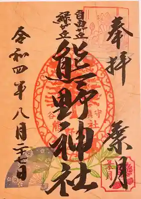 真ん中に熊野神社と書かれ、上部真ん中に「自由が丘 緑が丘」の文字、左上に松の葉の印、真ん中に御神木と八咫烏のイラストが入った谷畑鎮守熊野神社の印、右下に緑のかぼちゃの印、下部真ん中に植物の印、左下に黄色のハロウィンかぼちゃの印が押されています。