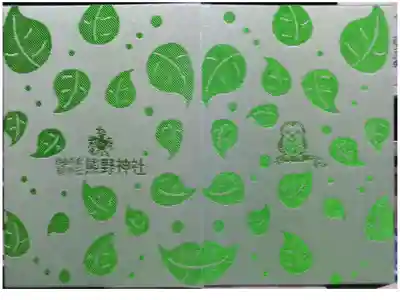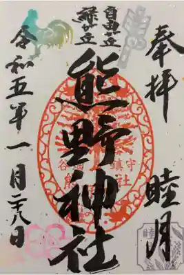 真ん中に熊野神社と書かれ、右上に「祝」の文字と目出鯛の印、上部真ん中に「自由が丘 緑が丘」の文字、左上に雪の結晶の印、真ん中に御神木と八咫烏のイラストが入った谷畑鎮守熊野神社の印、下部に水色で植物の印が押されています。