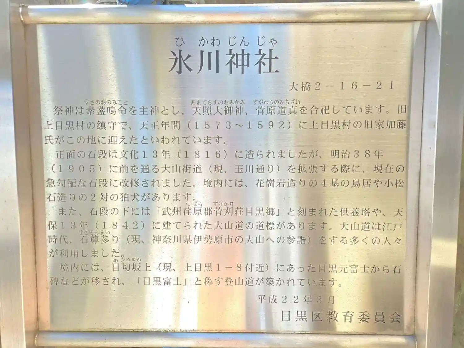 目黒区大橋にある村社の神社。主祭神は素盞嗚尊・天照皇神・菅原道真。創建は天正年間(1573-15…