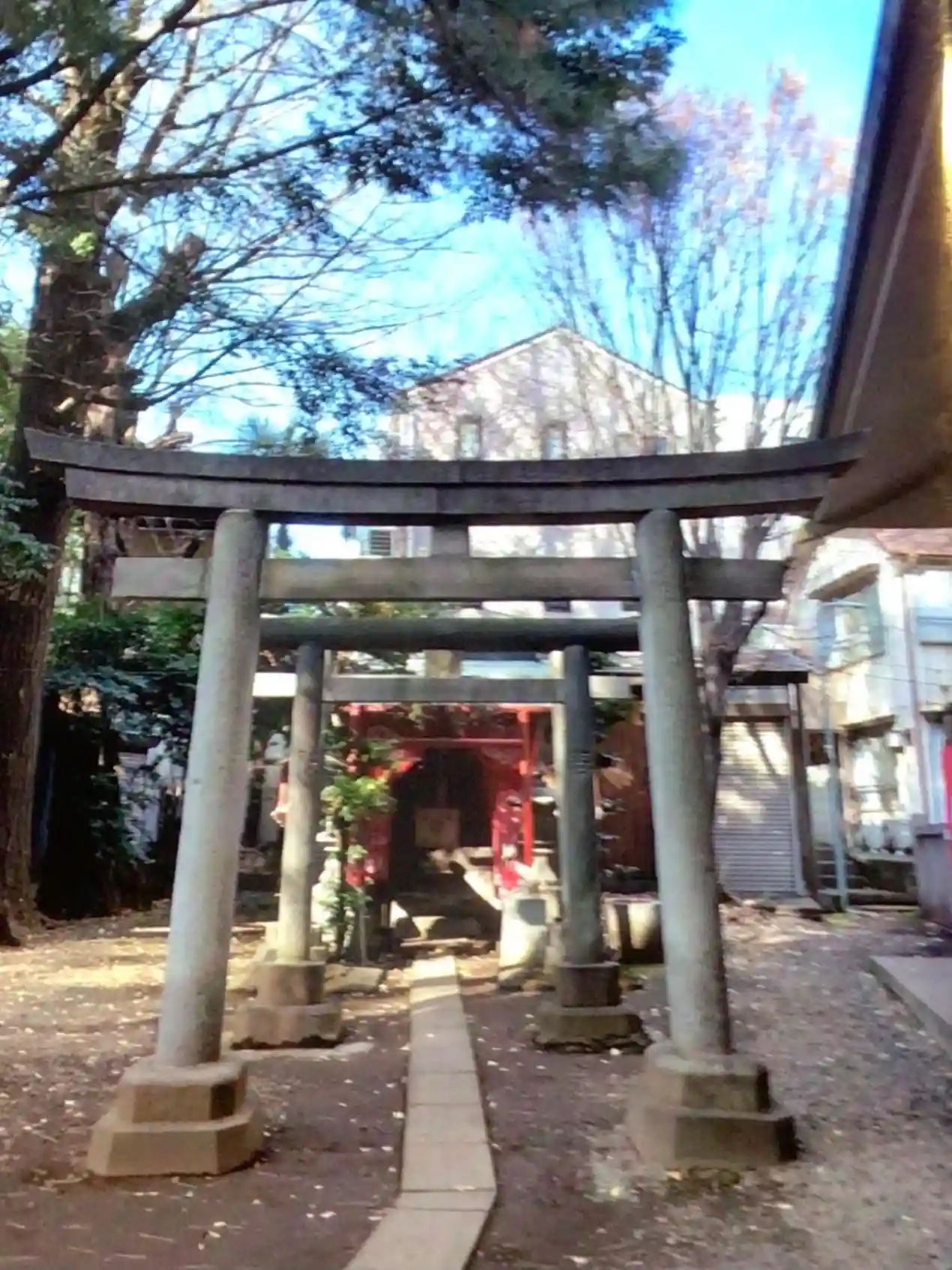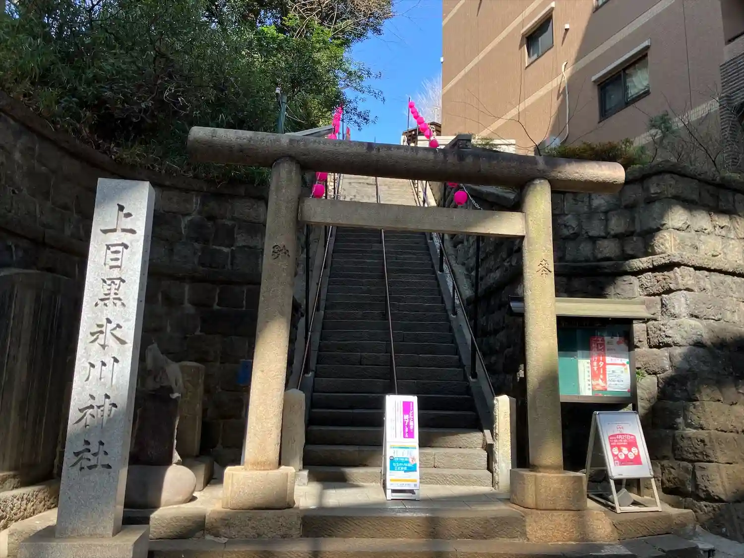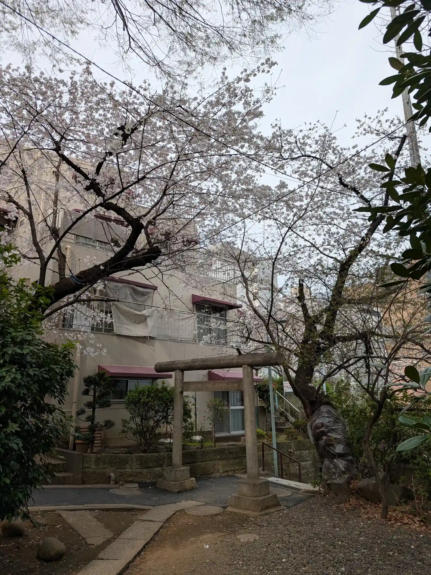 鳥居。目黒川近くは低地が広いので昔は崖に桜が並ぶ山に見えたことでしょう。