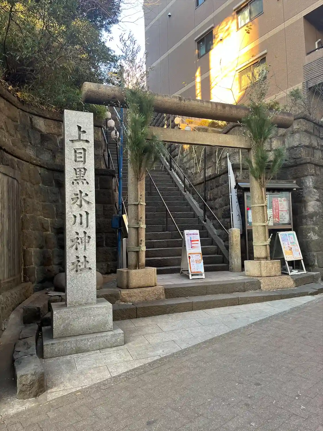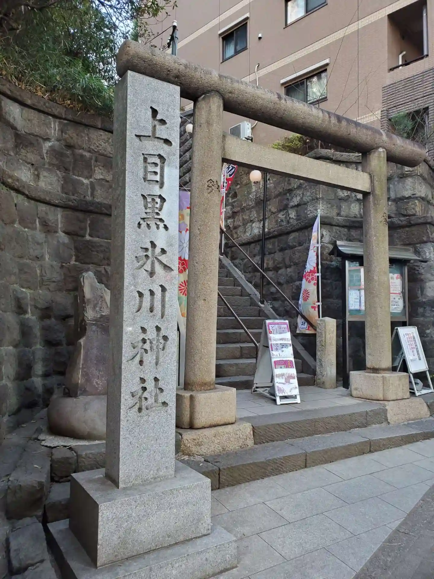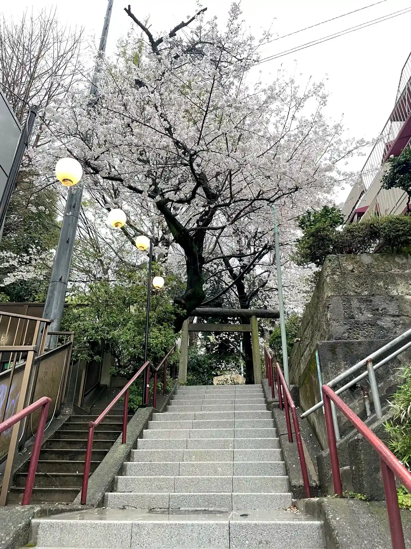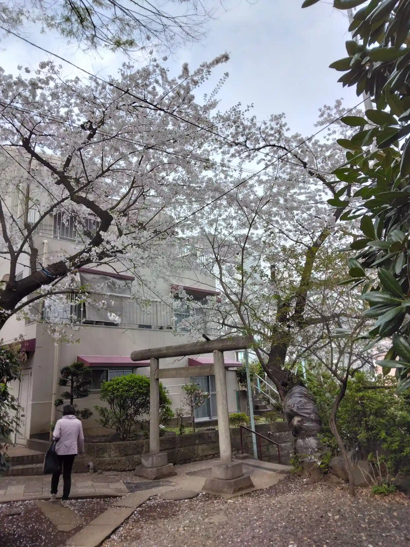 鳥居。目黒川近くは低地が広いので昔は崖に桜が並ぶ山に見えたことでしょう。