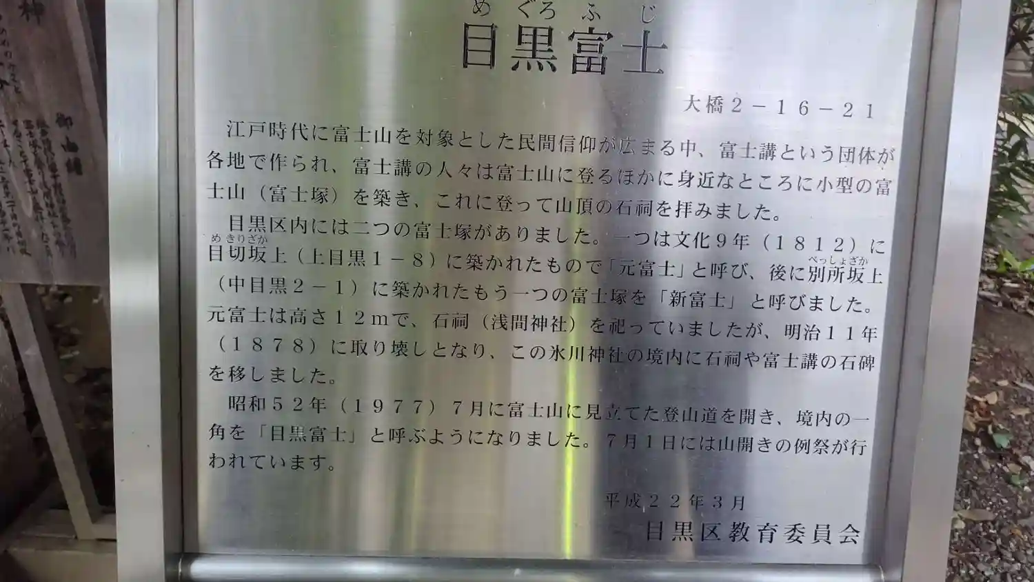 「目黒富士」の神社です。明治時代になって、取り壊された別の場所の富士塚から石の祠や富士講の石碑が…