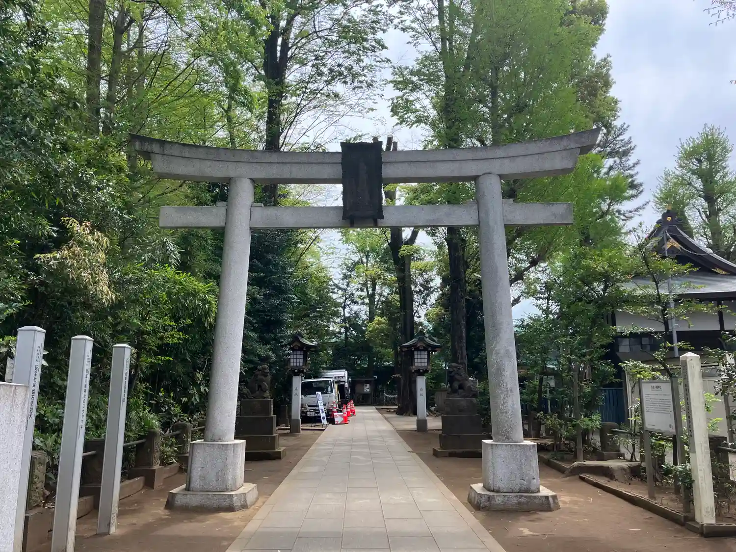 降って文明9年、太田道灌が石神井城を攻略するにあたり軍神祭を行い、社前に「高野槙」1株を植栽した。これが今なお社頭に聳える「道灌槙」である。天正19年、柏木右近命を受けて検地をするに及び社殿を修復し、別当松永山不動王寺宮本坊大泉院を置いた。その後も村人の尊崇篤く、数度の御造営を経て現在に至る。平成23年3月には東日本大震災により、東参道の大鳥居が倒壊したが、氏子崇敬者の奉賛により同年9月、同規模の石造鉄骨入り大鳥居を再建した。神社ホームページより