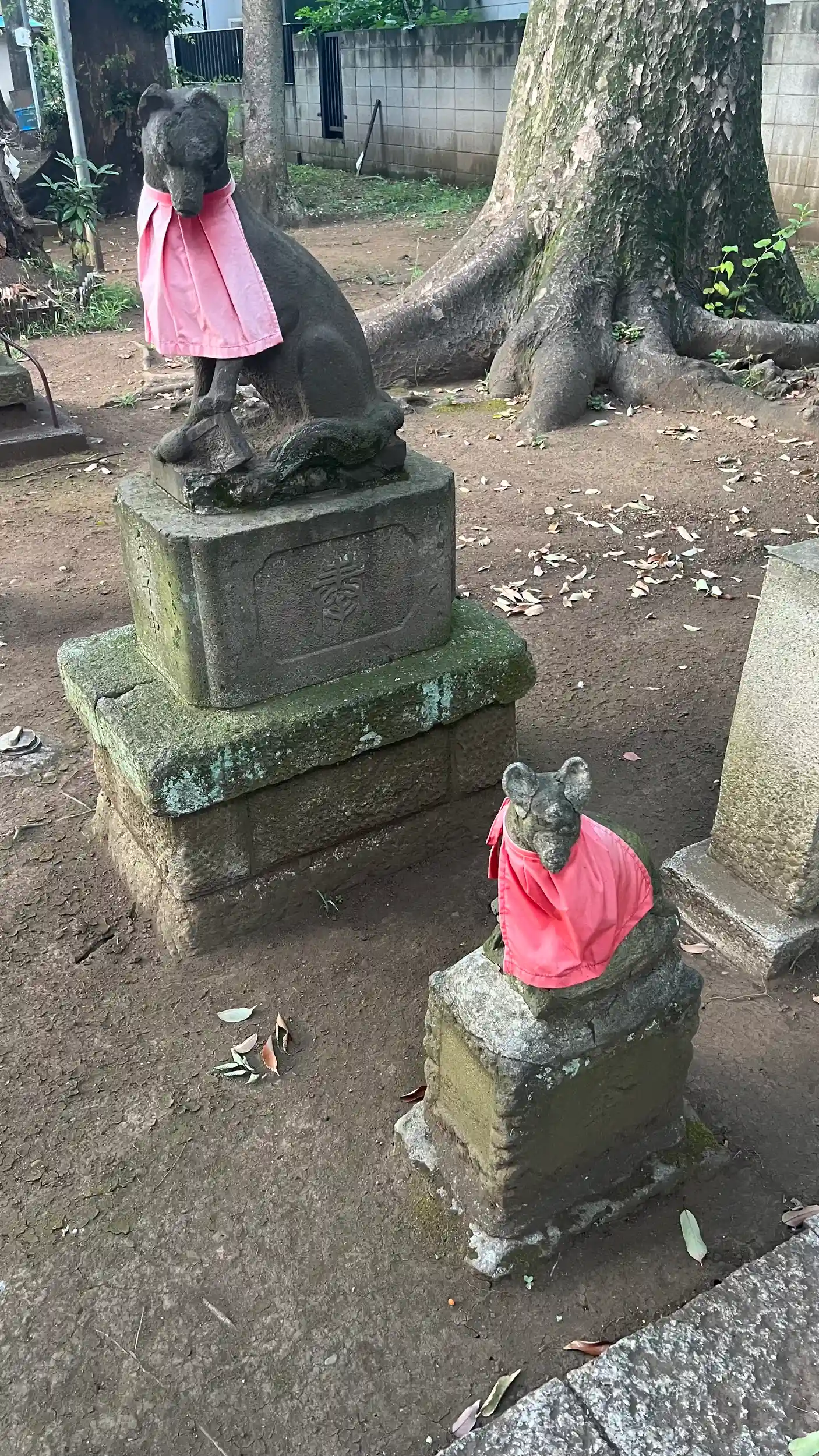社殿の前には、赤い布で丁寧に飾られた狛犬の像が左右に鎮座しています。一方の狛犬は口を開き、もう一方は閉じており、伝統的な「阿吽(あうん)」の形を成していました。布の色は鮮やかで、参拝者による感謝や祈りの象徴として大切にされている様子が伺えました。