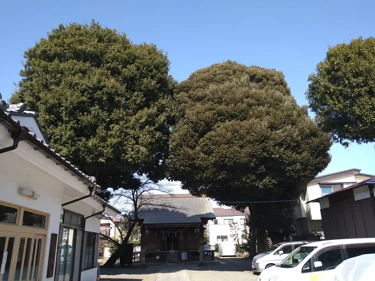 2本の大きな樹に挟まれるように拝殿があります。