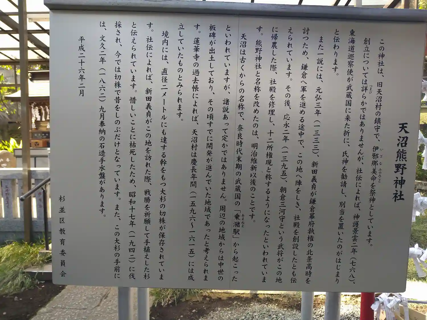 新田義貞公が鎌倉幕府を倒す為、鎌倉へ進軍中(1333年)この天沼の熊野神社に立ち寄り勝利を祈願してお手植えした杉と伝えられています。