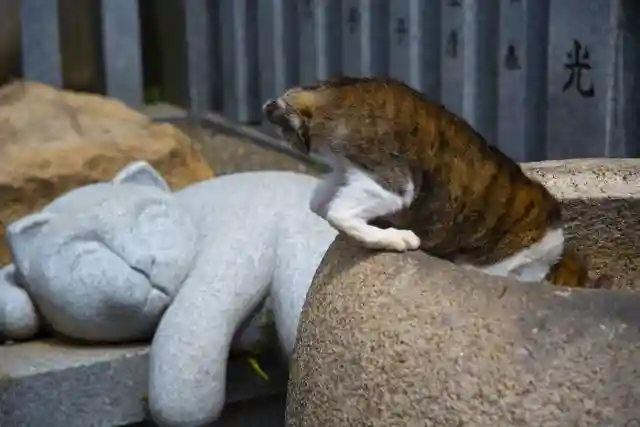 猫の置物のところにネコが水を飲みにきてました