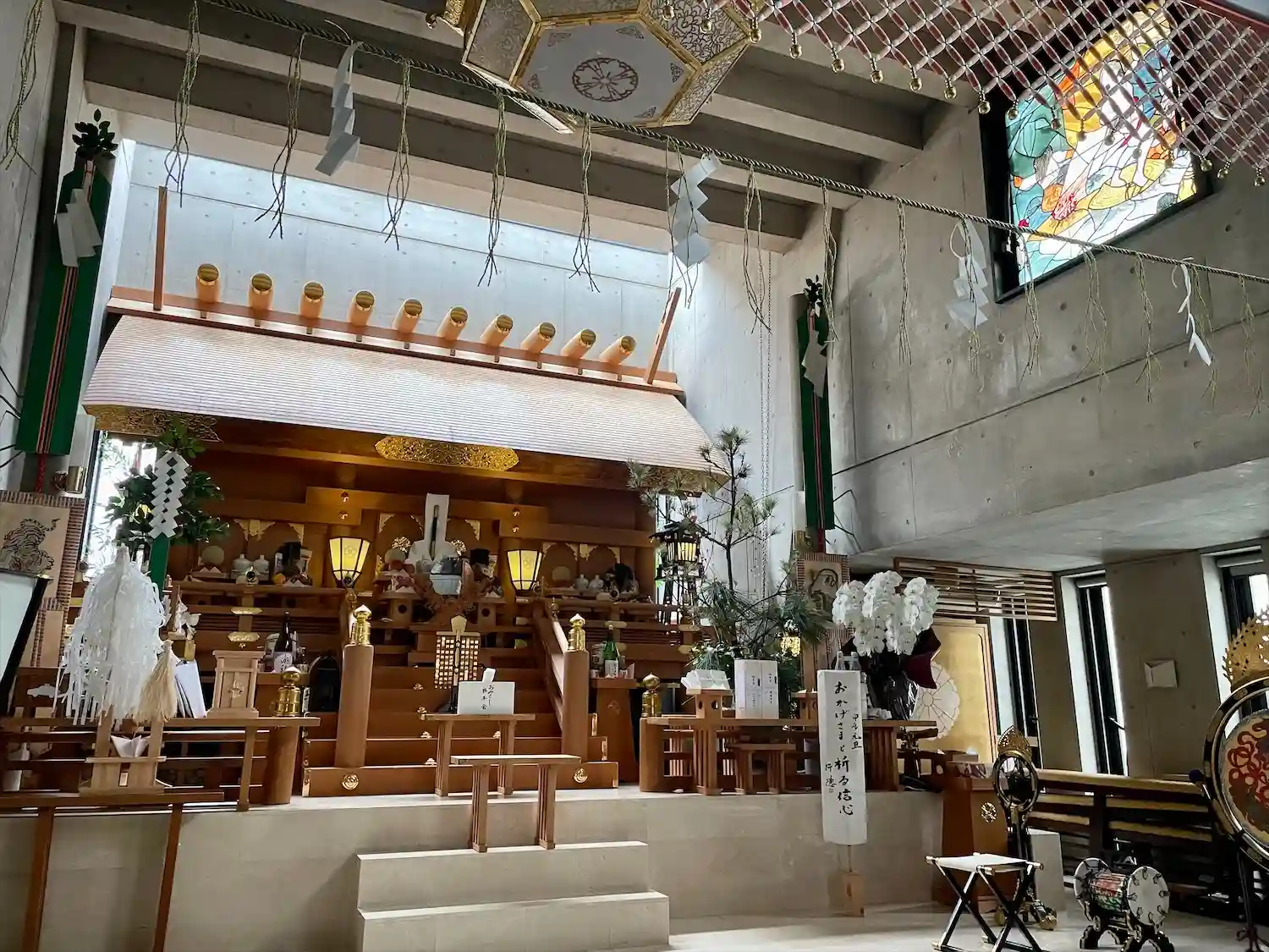 右上にはステンドグラスがあり、国造り伝説と天岩戸伝説が描かれています。