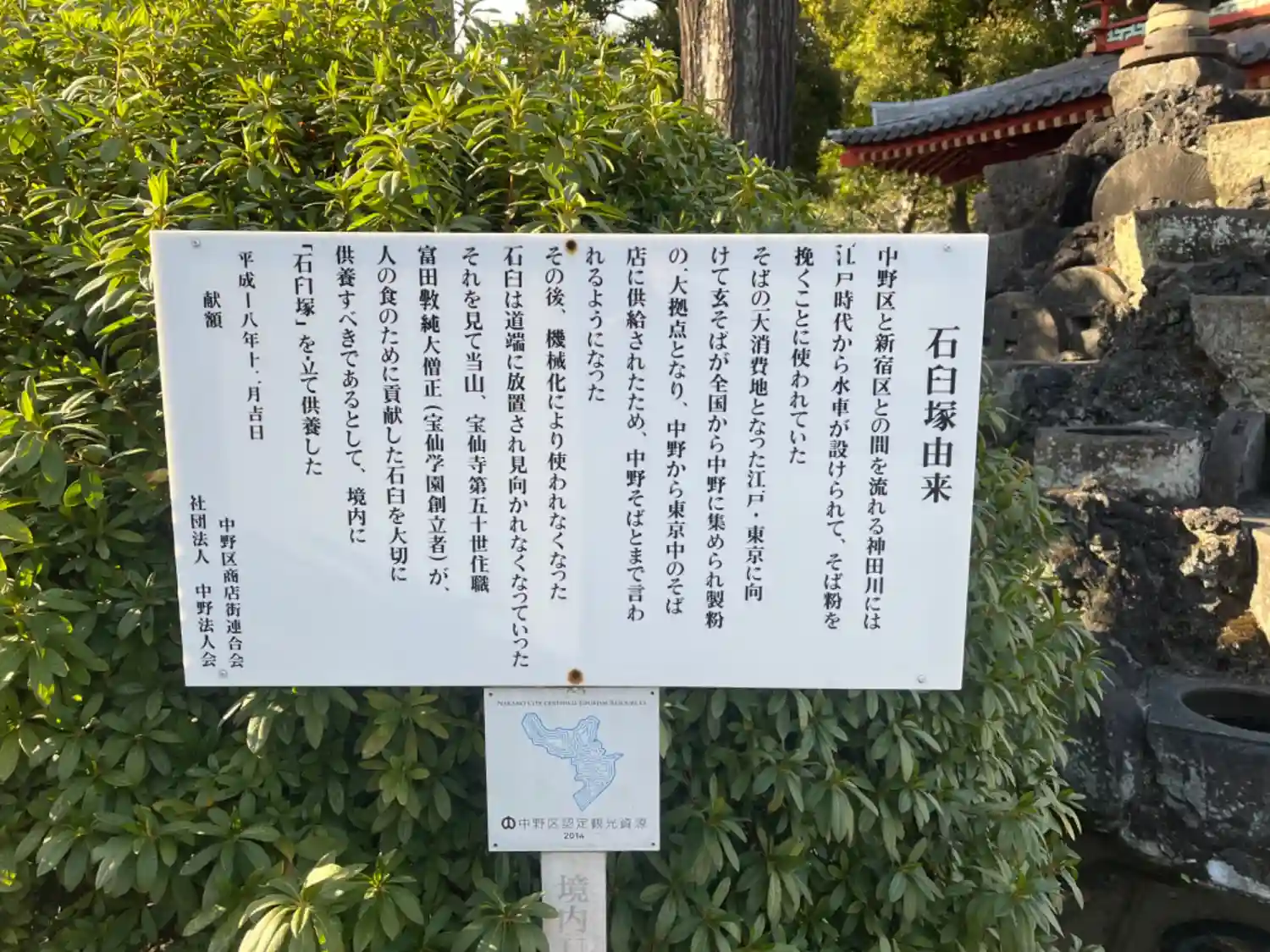 境内には「石臼塚」があります。説明板によると、新宿区と中野区の間を流れる神田川には江戸時代、水車…