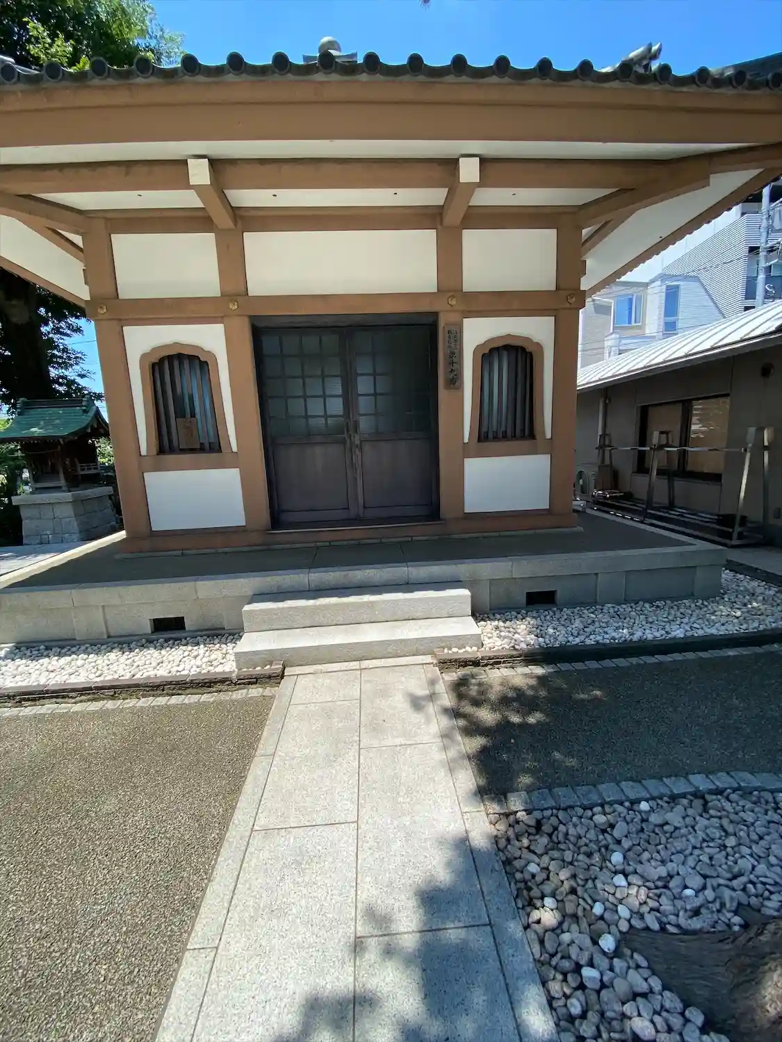 本堂の左手に<観音堂>。観音堂が閉まっていたので、御朱印拝受時にお寺の方に聞いてみると、かつていたずらに遭ったため普段は閉めているが、人が入れないぐらいの幅だけ開く設定になっているとのこと。「開かなかったら仰ってください」と丁寧な回答をいただいた。