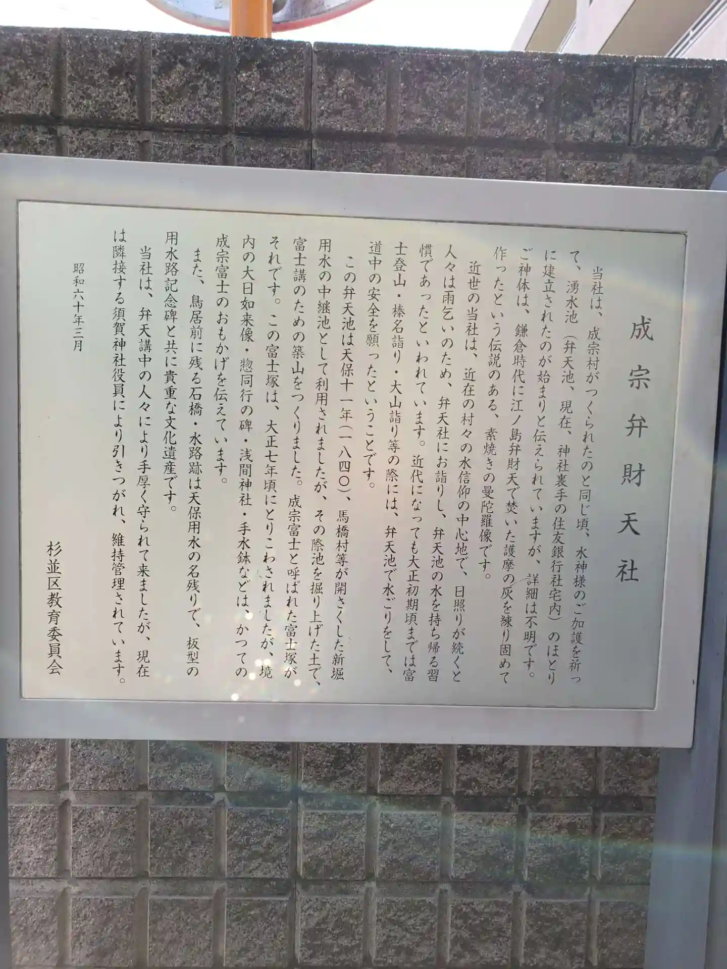 都立杉並高校の目の前。拝殿の左側に境内社、その前に水琴窟が有ります。耳をあて、その調べを聴いている…