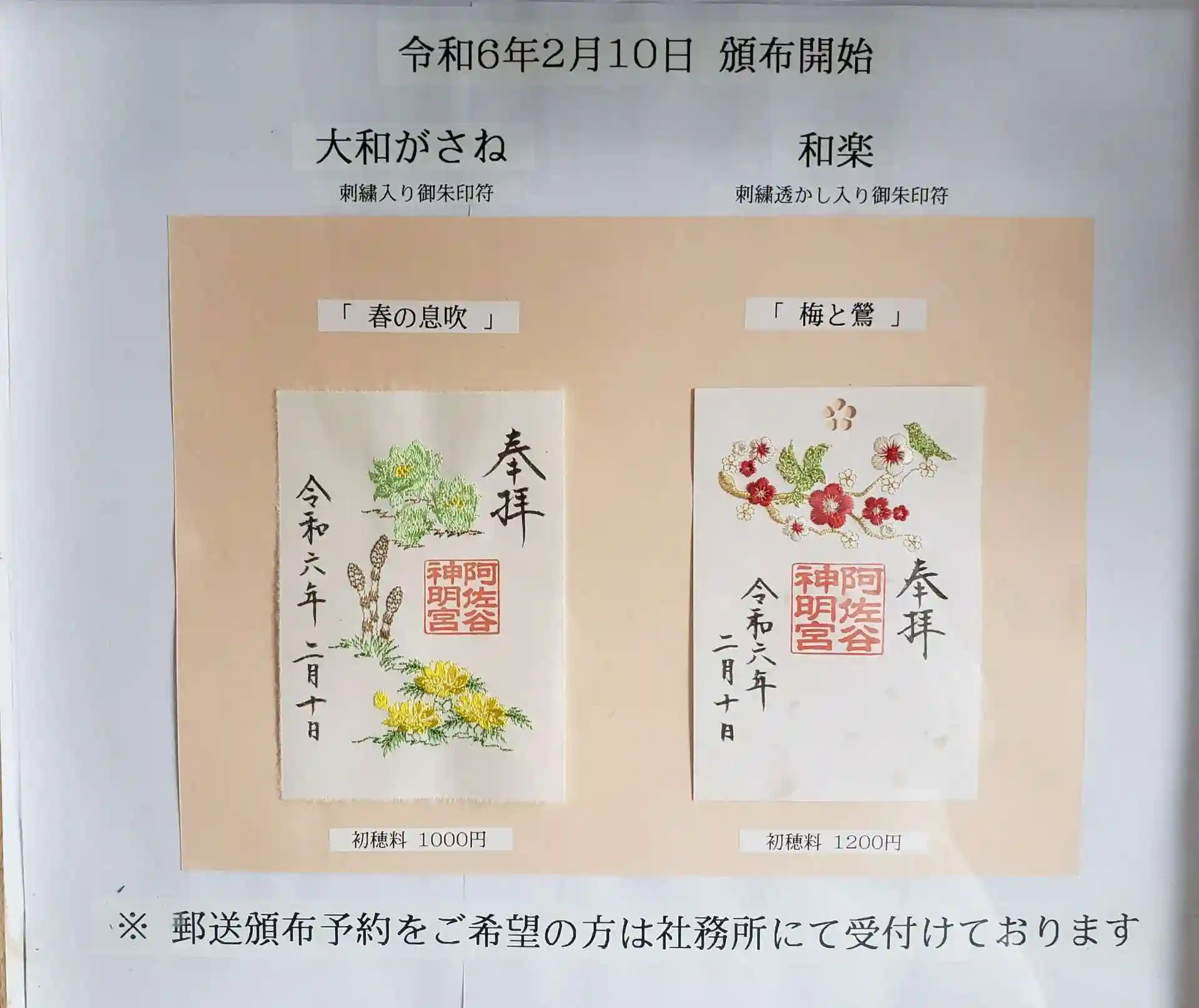 人気の刺繍入り御朱印符の次回頒布は2/10です。事前に社務所でも送料含め先支払いで郵送受付していますが、現金書留でも郵送受付しています。ご自宅から申し込みされたい方がいらっしゃったら公式サイトをご参照下さい。