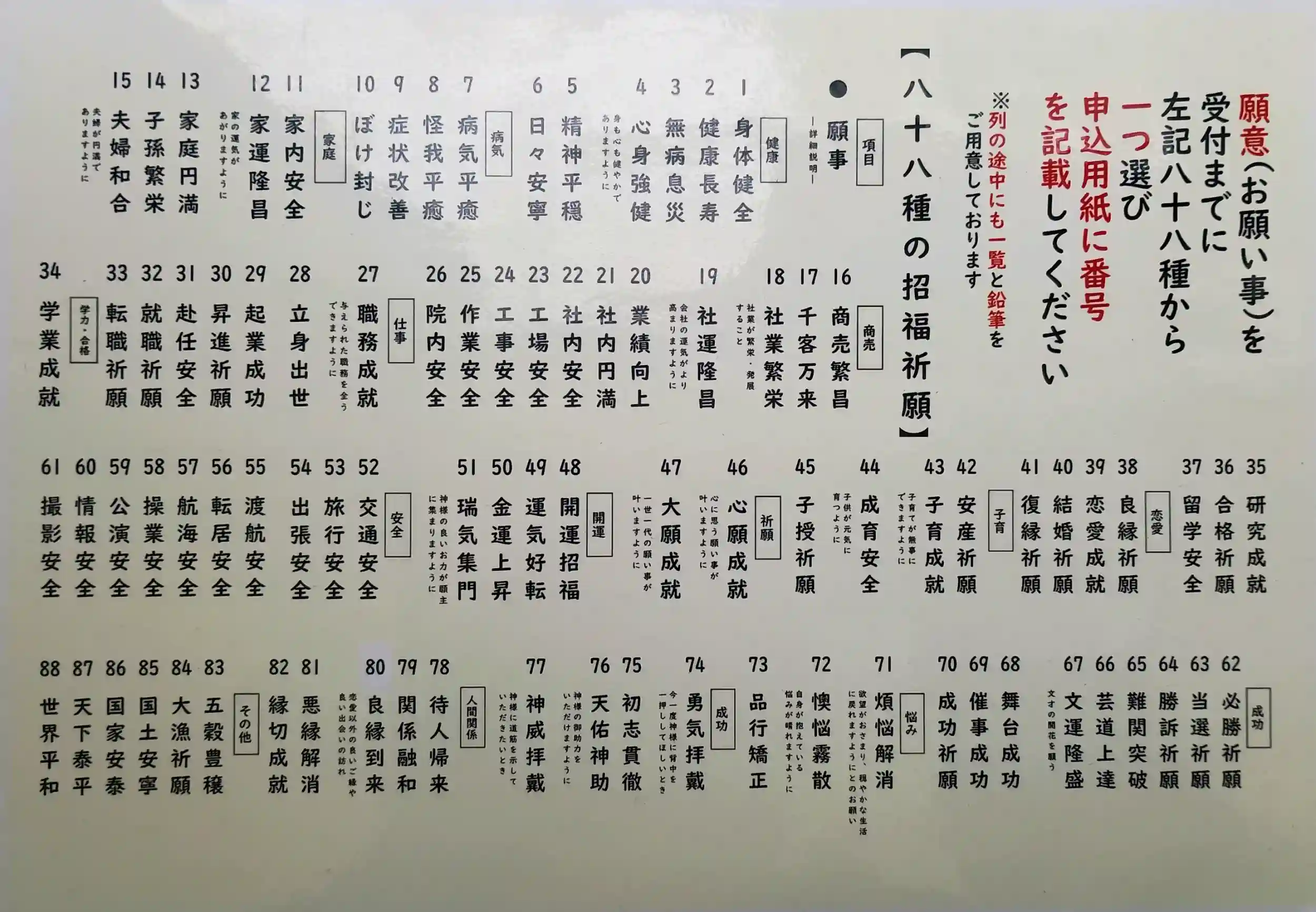 阿佐ヶ谷神明宮の八難除のご祈祷を受けに参拝。ご祈祷は、拝殿左手側にある降臨殿(祈祷殿)前で八難除に88種類の願いを込める「すえひろ祈祷(招福祈願)」が特徴で自分の希望するものを記載して申込み。手続き後、待合室に。待合室には手を清める手水舎やお茶や個包装の金平糖がありました。ご祈祷後、御垣内での参拝し授与品をお受けして終了です。