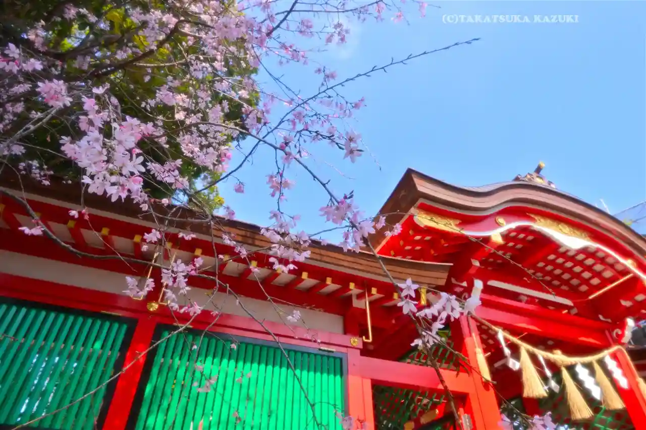 本殿前の朱塗りの随神門は、昭和五十(1975)年鎮座七百年記念事業として建立されたもので、左右の随神像に磐間戸神を祀り、中央天井に都内最大といわれる開運の大鈴(直径七十五センチメートル)が吊るされています。当社の神輿は、高さ2.5メートル、台幅1メートル、重さ1.5トンの白木造りの大神輿で、大正十一(1922)年の平和記念東京博覧会に出品されたものです。