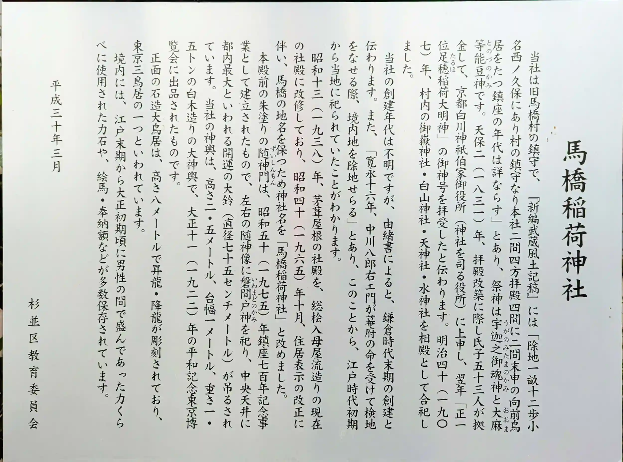 昭和7年杉並村が大東京市に編入されたことを記念して関口林之助氏により奉納されました。