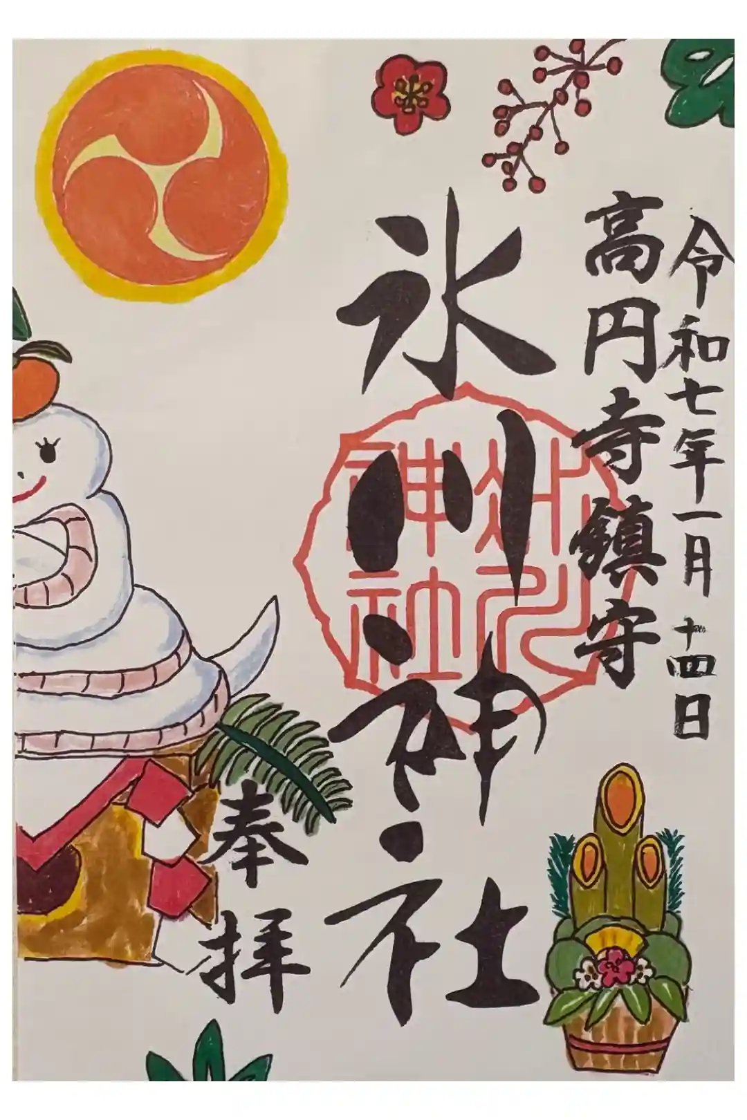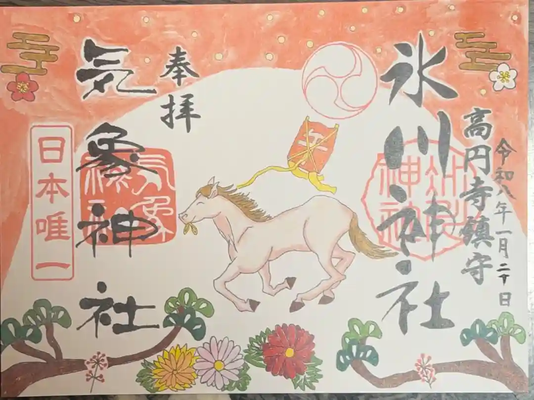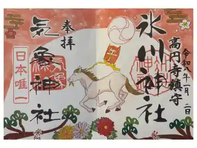 真ん中に氷川神社と書かれ、右に高円寺鎮守の文字、真ん中に氷川神社の社印、左に松竹梅の三つ巴の印、右下に干支のねずみちゃんの印が押されています。