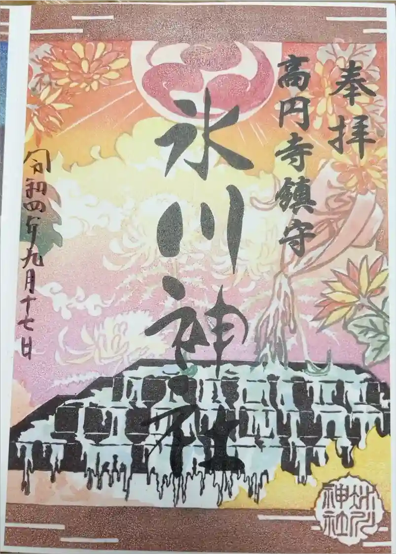 真ん中に氷川神社と書かれ、右に高円寺鎮守の文字、真ん中に氷川神社の社印、左に彼岸花の三つ巴の印、右下にかぐや姫の印が押されています。