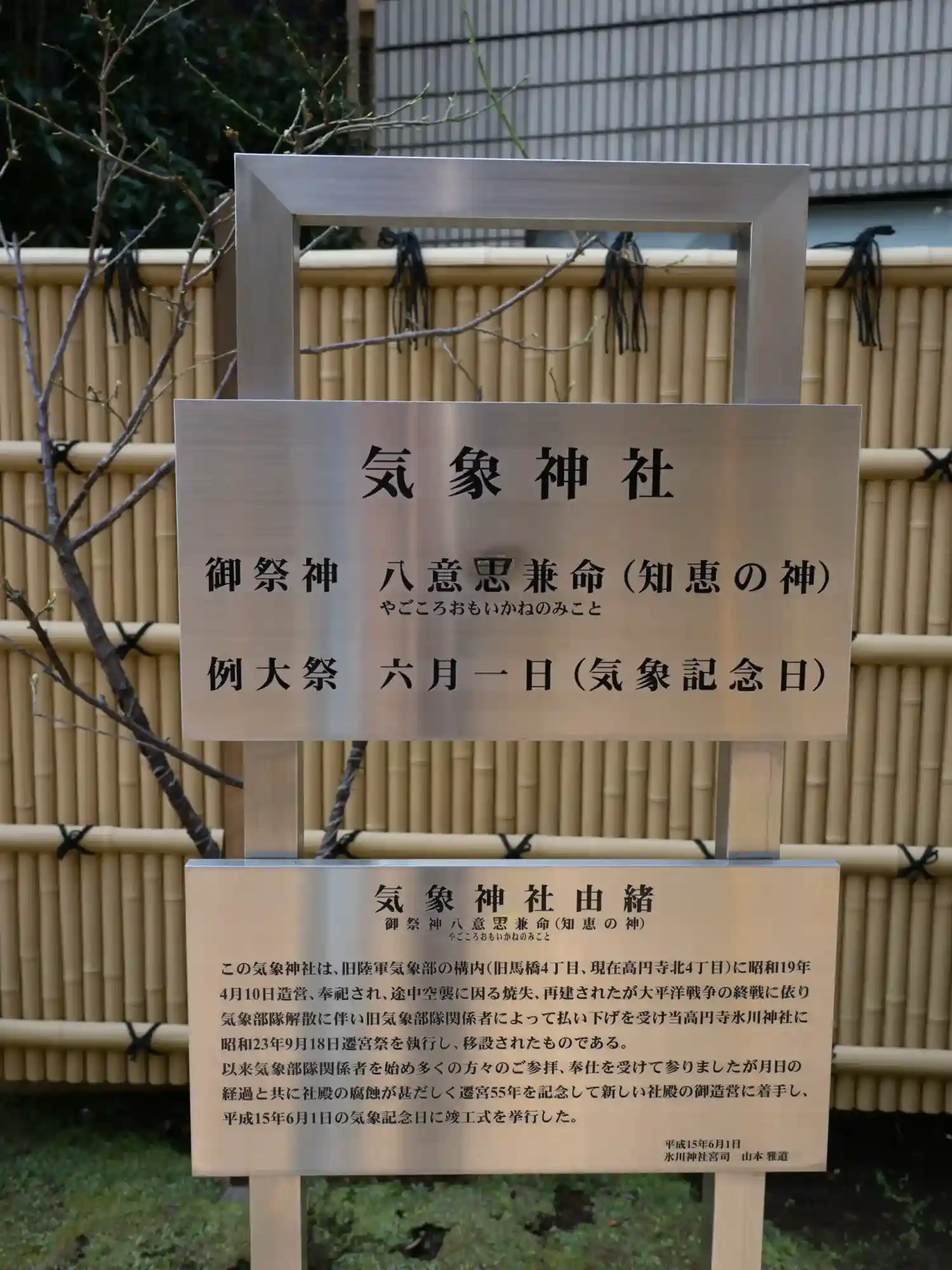 高円寺に鎮座する気象神社は1944年(昭和19年)に大日本帝国陸軍の陸軍気象部の構内に造営されました。