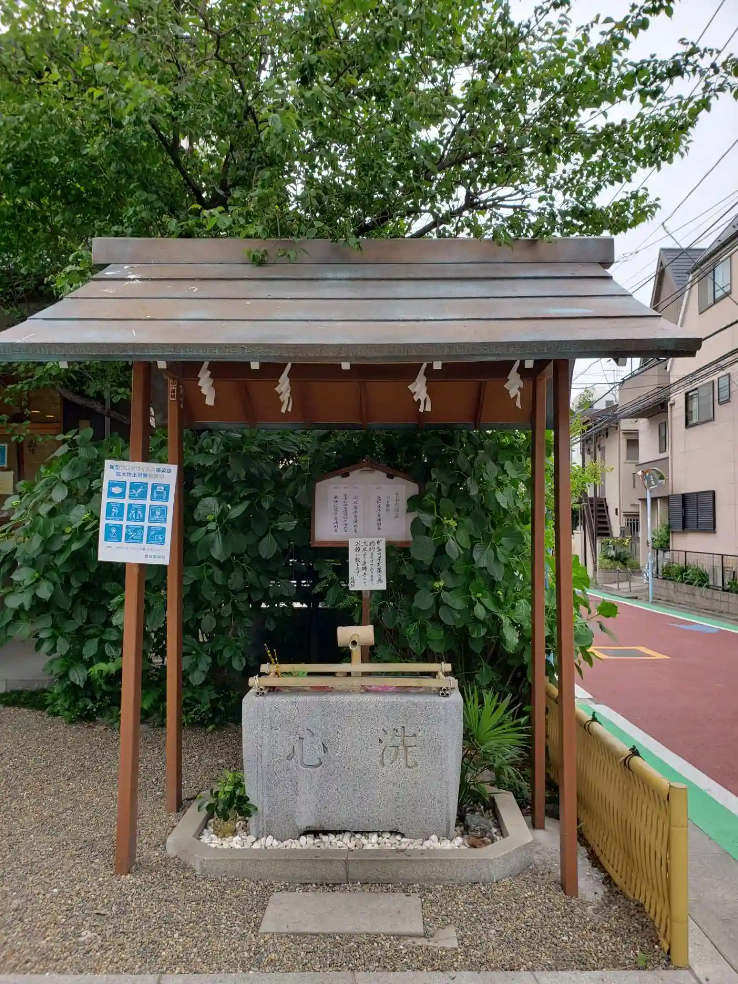 青梅街道を新宿側から高円寺方向へ…丸ノ内線がずっと地下を通っているので、自分の位置が分かり易いです!地下鉄のため、出入口を目視しながら、東京メトロの東高円寺駅を通過し、新高円寺駅を過ぎたらファミマの先を右に入る…少し行くと道路沿いに突然鳥居が現れます!少し奥まっているとか、下がったところではなく、本当に道沿いに