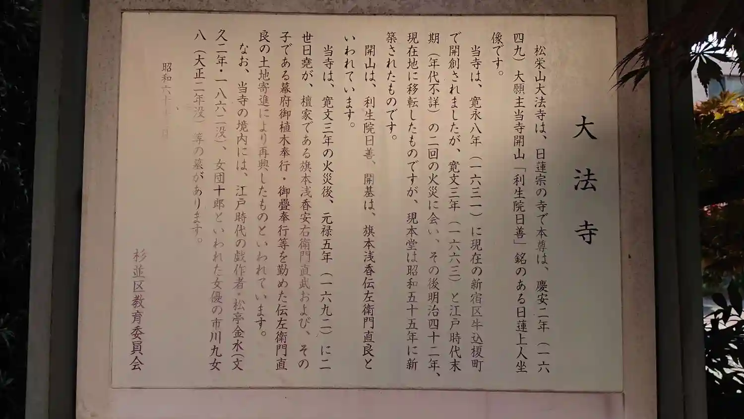 大法寺(だいほうじ)は、東京都杉並区松ノ木に位置する日蓮宗の寺院で、山号は松栄山である。1631年(寛永8年)に牛込榎町(現・東京都新宿区榎町)に創建され、開山は利生院日善、開基は旗本の浅香直良であった。