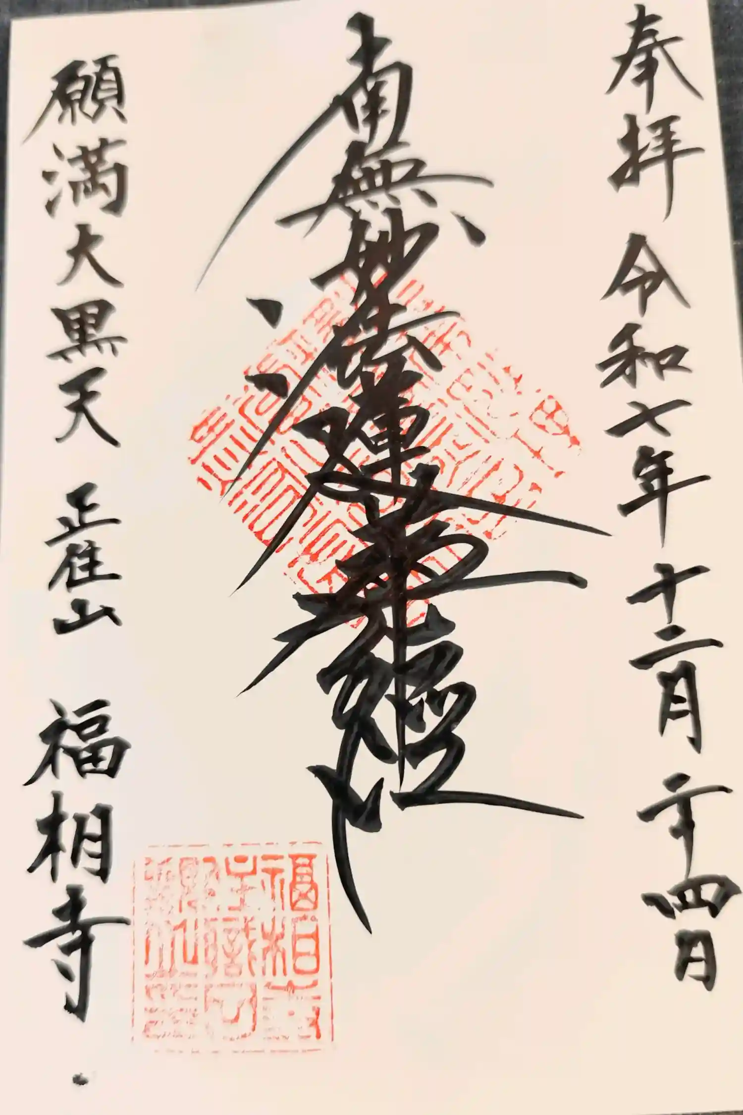 福相寺には、病気平癒や福を授けるとされる「願満大黒天」が安置されている。この大黒天像は、もともと大阪の佐藤家に伝わっていたもので、当寺16世・日元が清め祈願したところ、佐藤家の長病が全快した。この霊験を受け、佐藤家から当寺に奉納され、以来、鎮護の善神として大黒堂に安置されている。江戸時代には「来縁の記」が刷られ、庶民の間に広く信仰を集めた。現在も境内には、当時の参詣者が奉納した石塔が残る。