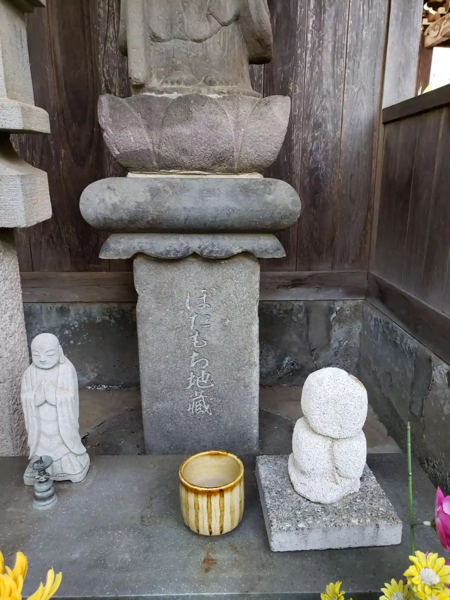 入って左手に、ぼたもち地蔵が。右手に境内末社がありました。