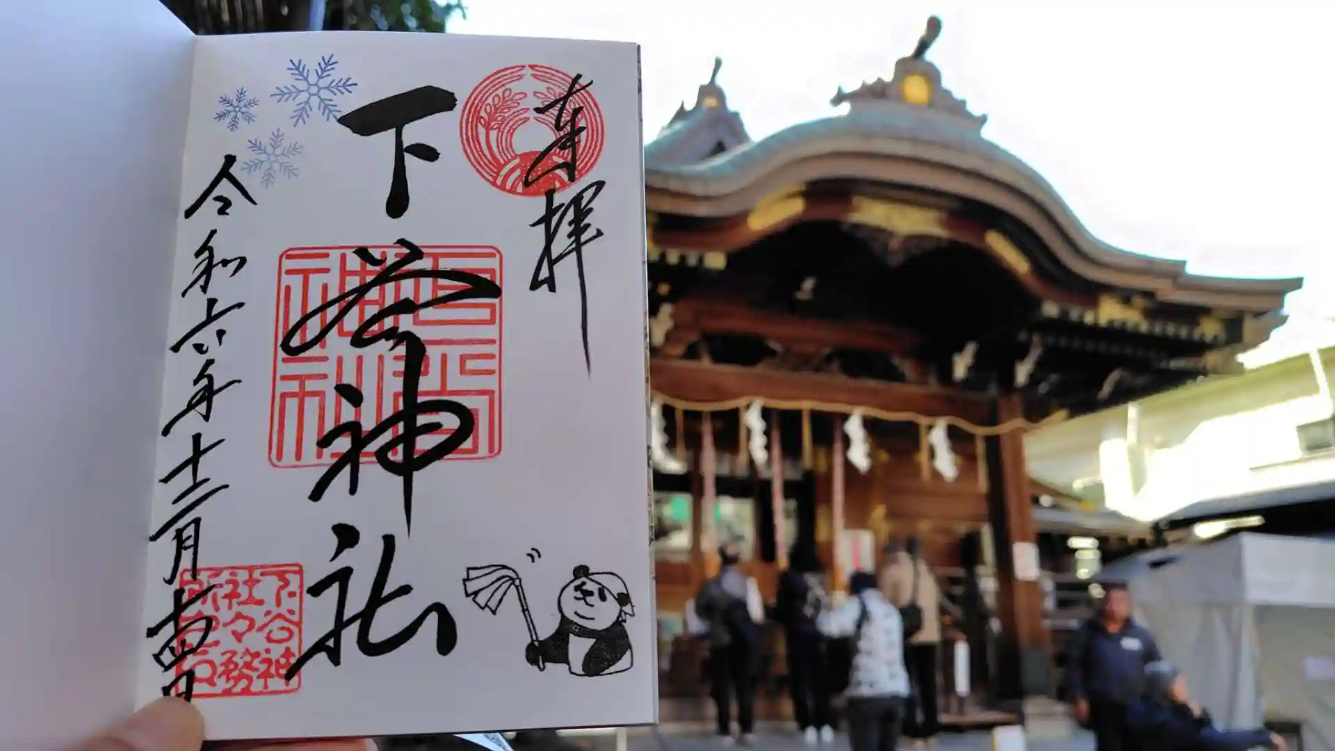 お参りしてから御朱印をいただく。直書き500円。そういえばこの神社で御朱印帳を求めたことがあって、それは神社の拝殿の天井に描かれている横山大観の龍をデザインしたもの。天井絵の実物を見たことはないのだが。今回いただいた御朱印には大掃除をするパンダがスタンプされている。年末だねえ。