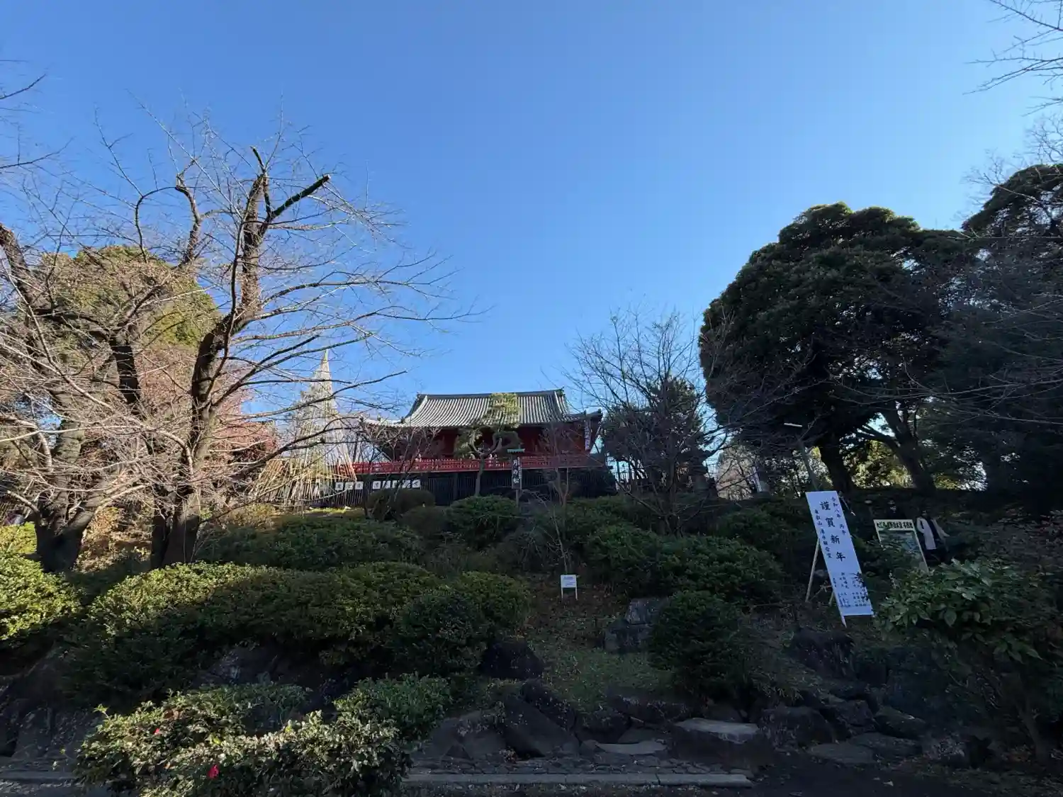 上野公園に建つ清水観音堂を参拝しました。京都・清水寺を模して建立されたお堂で、境内に足を踏み入れると、赤く塗られた舞台がまず目に入ります。規模は小さいながらも、懸造りの姿は本家を思わせ、上野の森に映える佇まいです。舞台正面には、浮世絵にも描かれた名所「月の松」があり、枝が輪を描く独特の姿にしばし足を止めました。本堂も朱色に彩られ、落ち着いた中に華やかさがあります。参道の石段脇では、大きな椿が花をつけ、季節の移ろいを静かに告げていました。多くの人で賑わう上野公園の一角にありながら、観音堂周辺はどこか穏やかで、江戸から続く信仰と風情を感じられる参拝となりました。