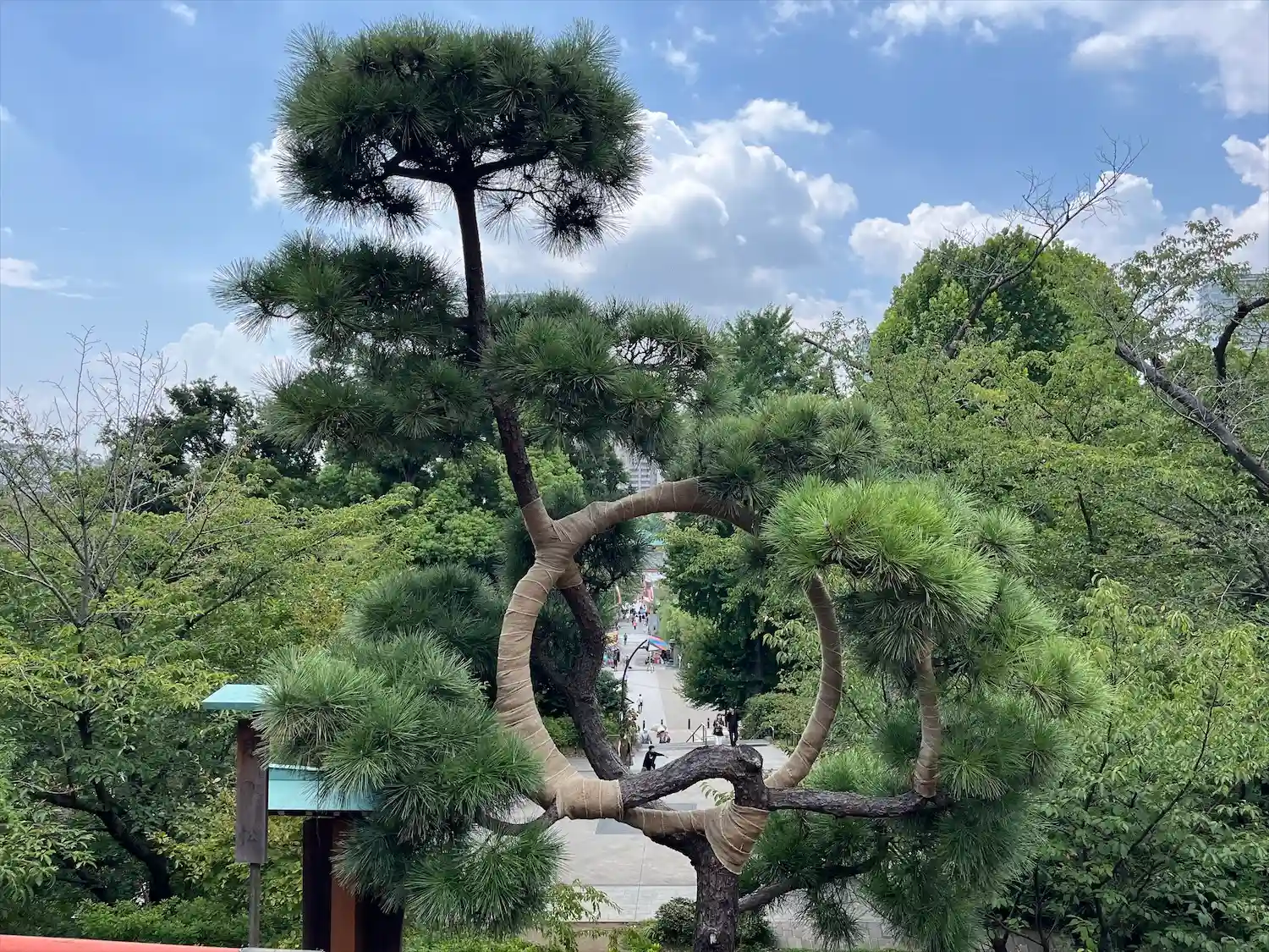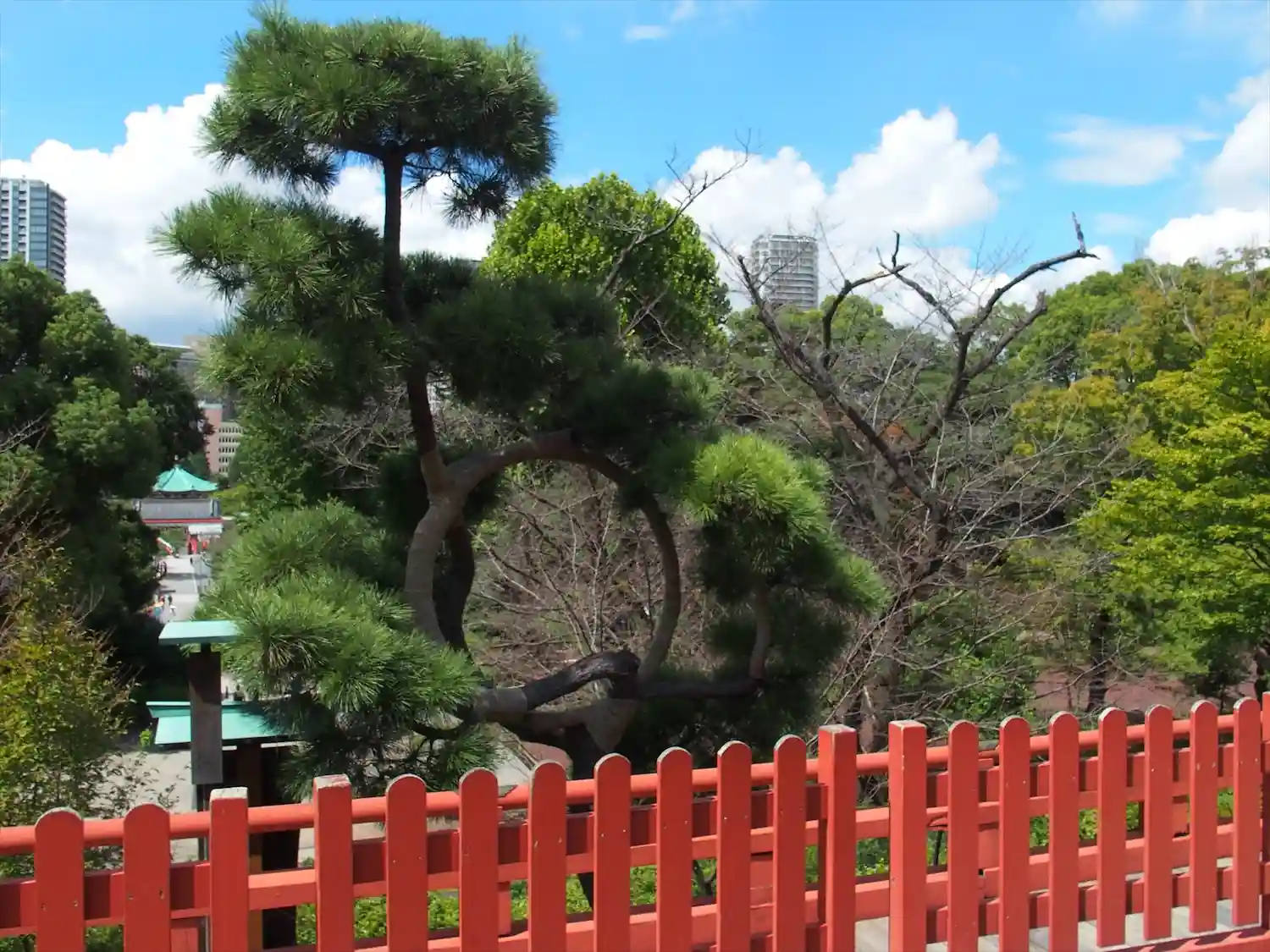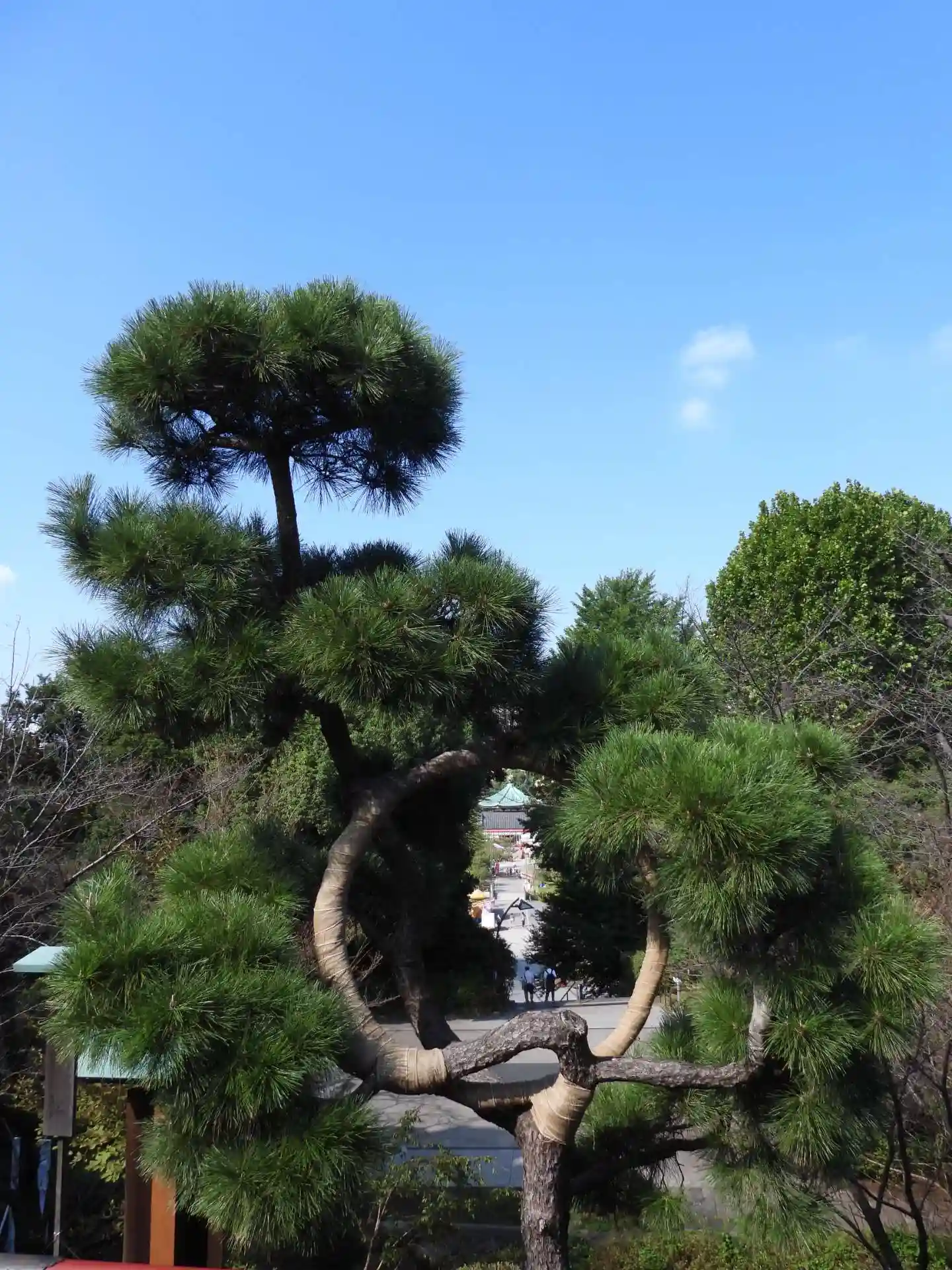 月の松は不思議な形ですが、社殿を背景にして下か…
