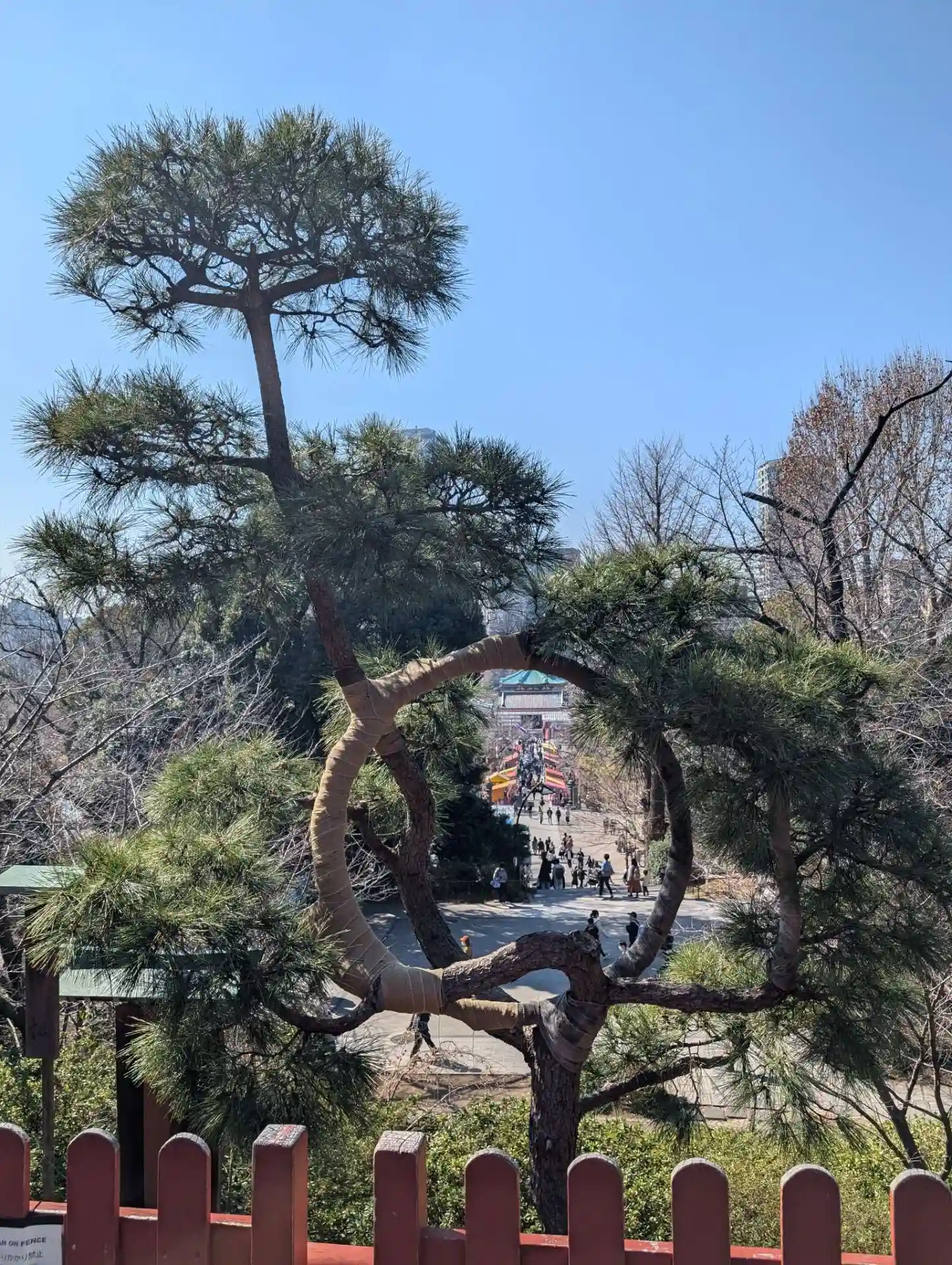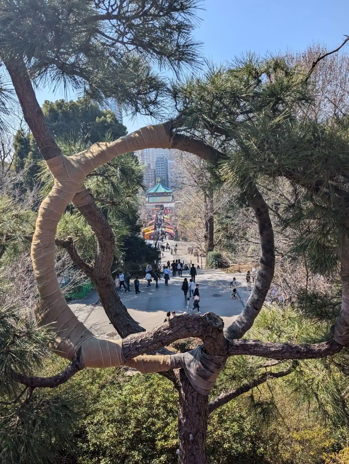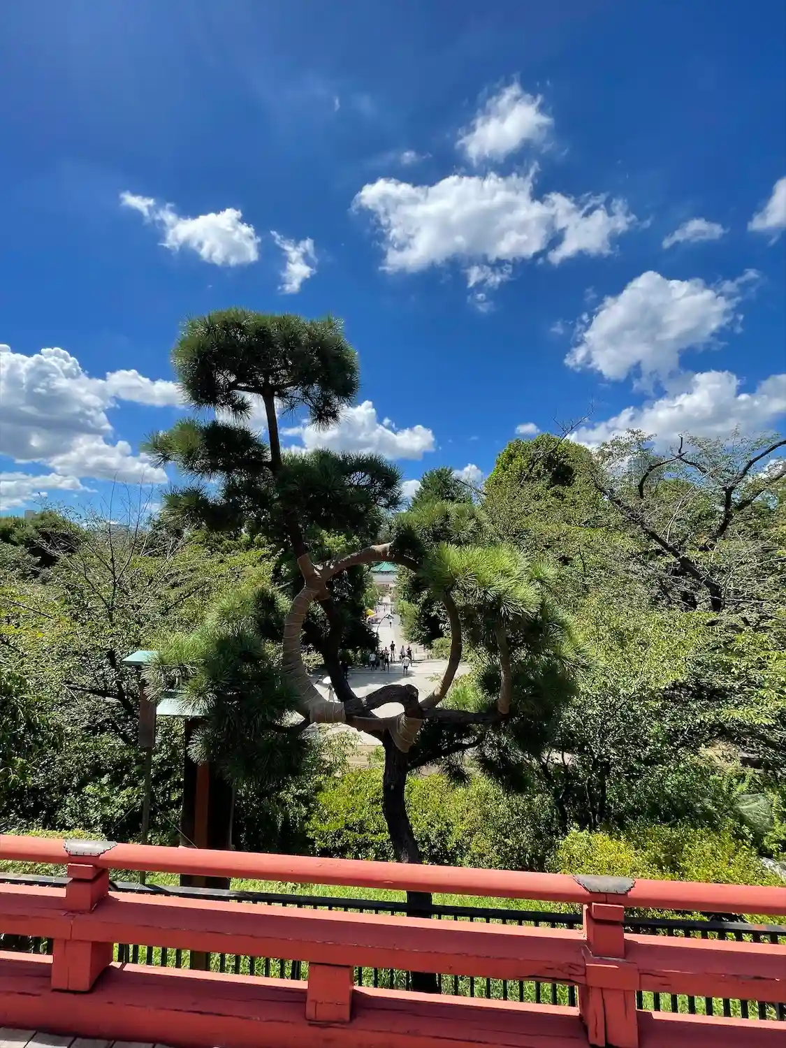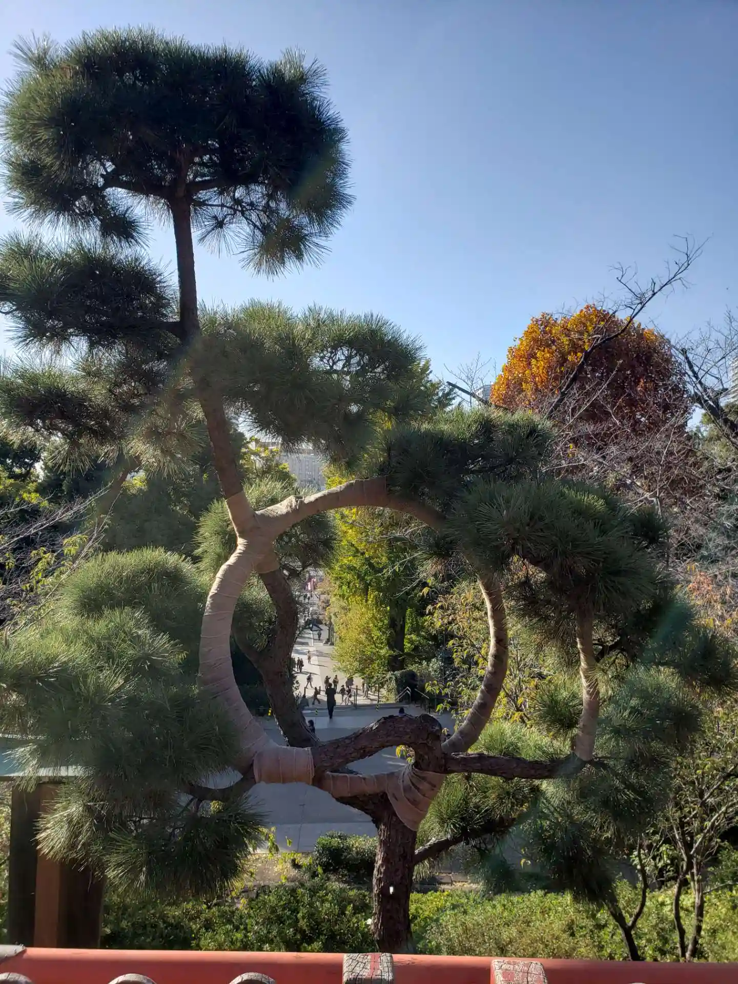 月の松は不思議な形ですが、社殿を背景にして下か…