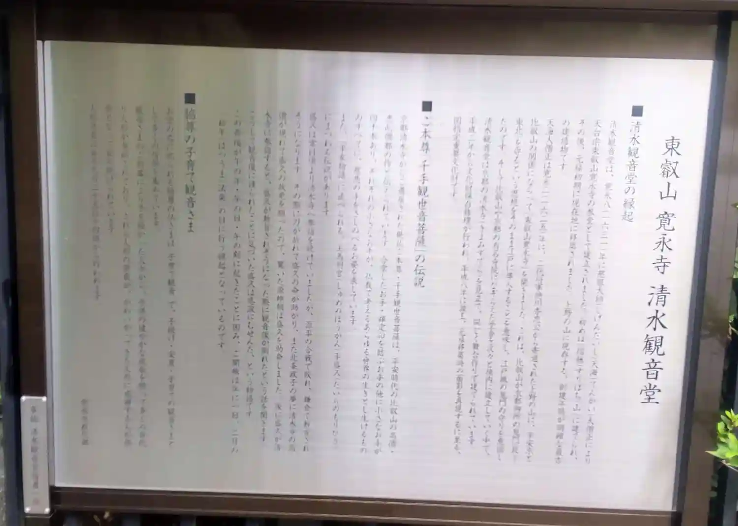 上野公園内にある、京都の清水寺を見立てた舞台作りのお堂です。御本尊の千手観音菩薩は平安時代のものと…
