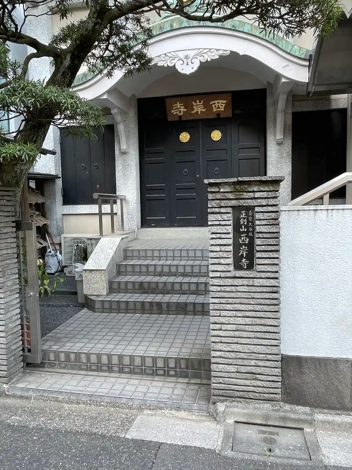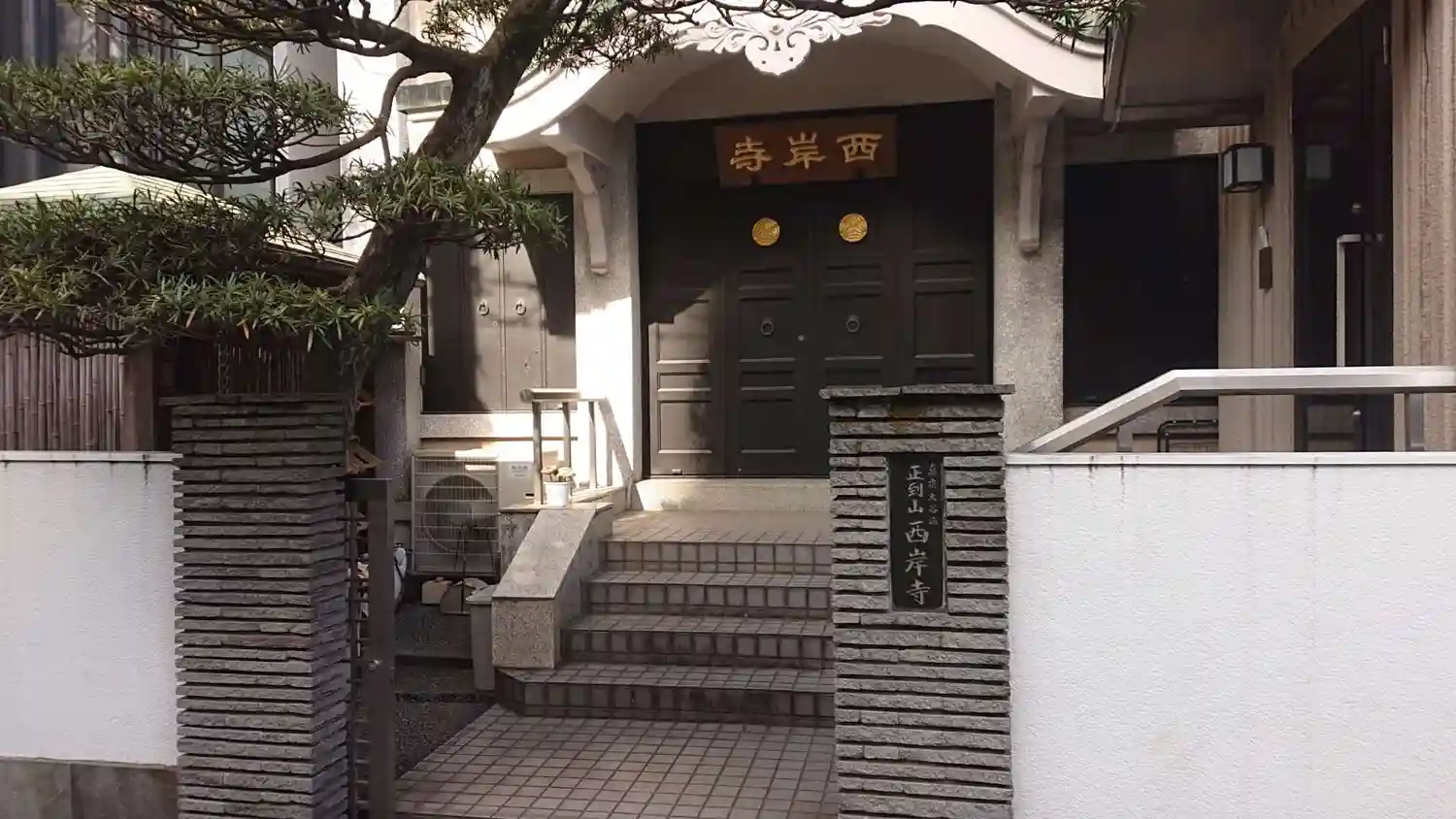 西岸寺の敷地は78坪余りで、近代的な本堂が建てられています。周囲の風情とは異なり、自宅を改装したかのような印象を与える本堂は、松の木がシンボル的に存在感を放っています。
