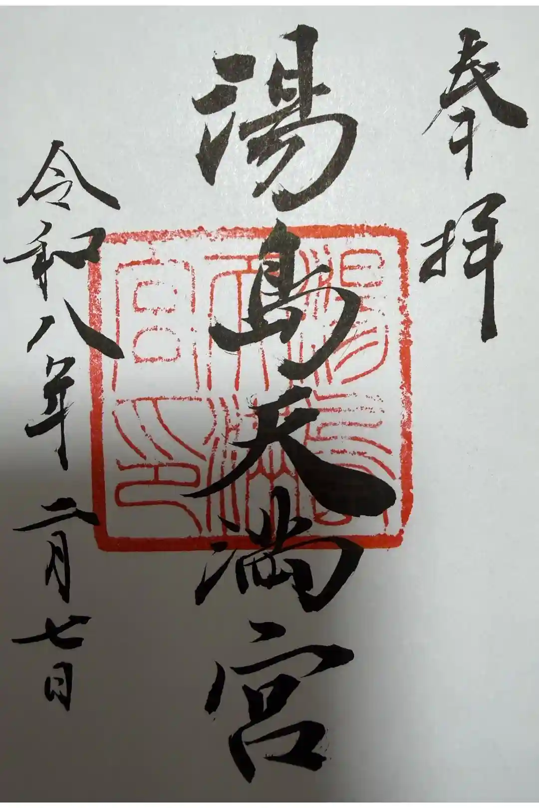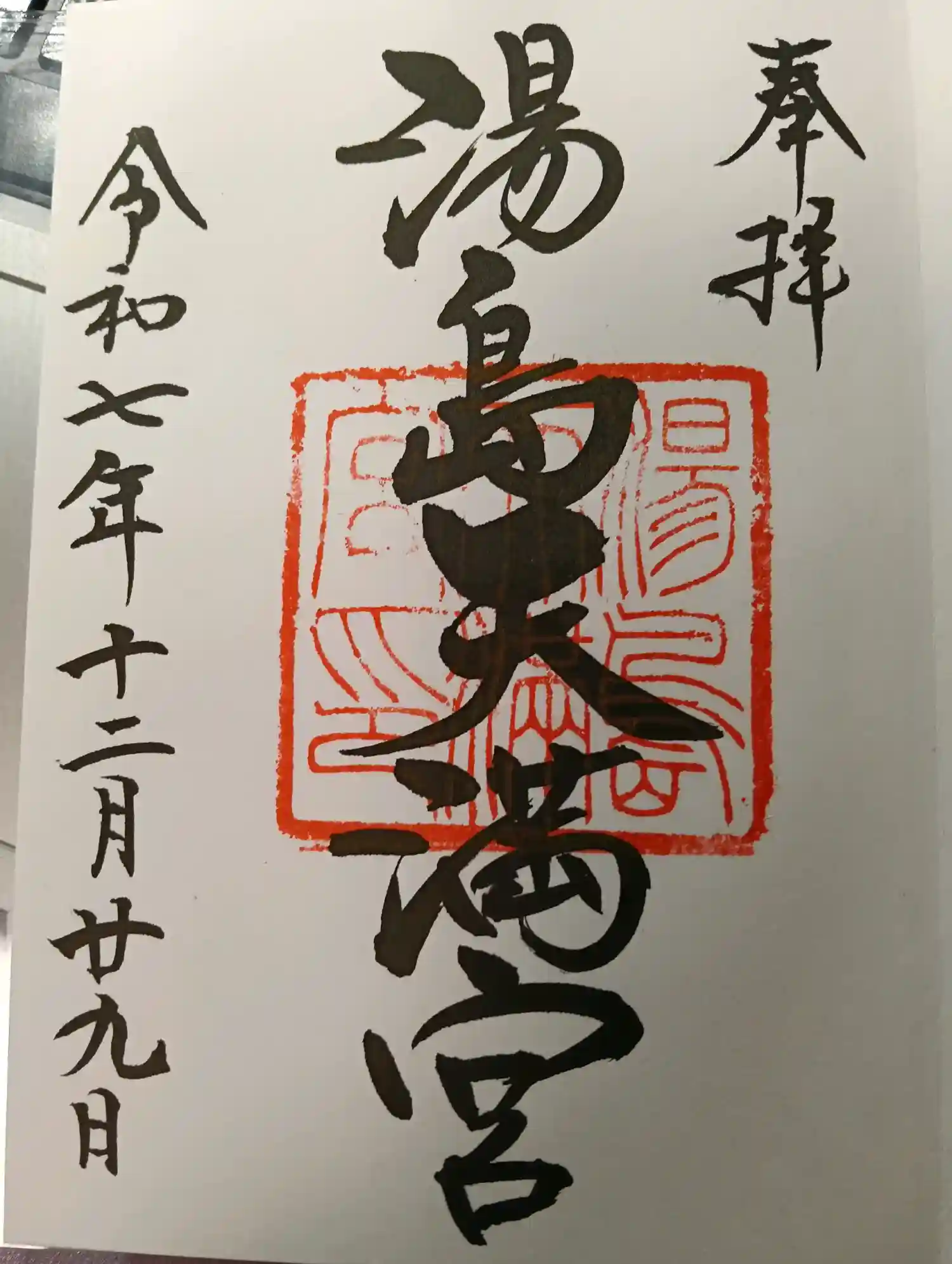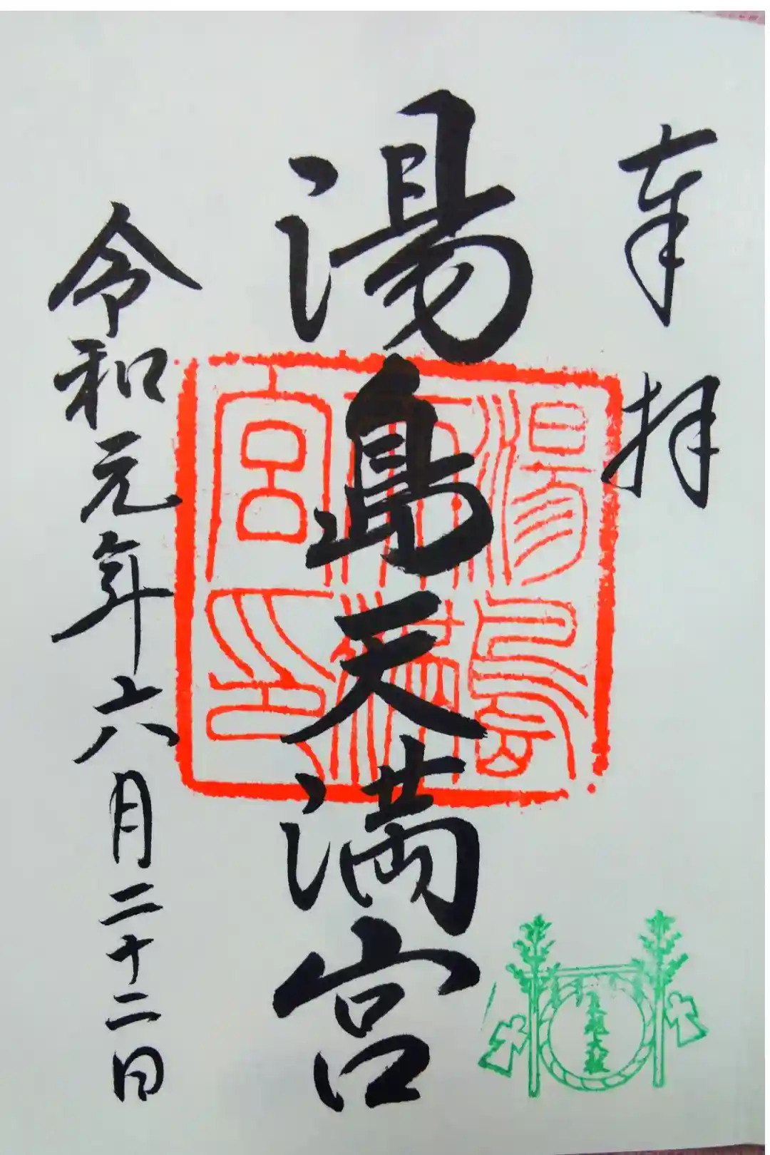真ん中に湯島天満宮と書かれ、湯島天満宮印が押された御朱印です。