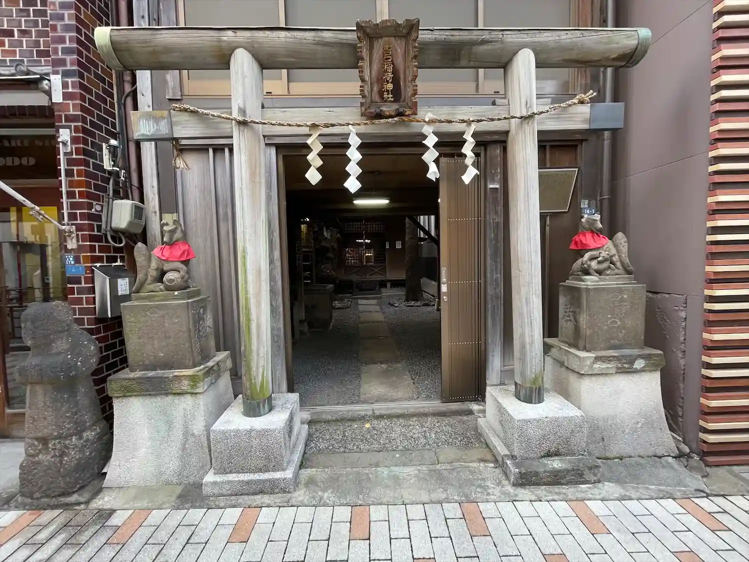 最初、渋い店構えの骨董品屋さんが目に入り近づくと隣に鳥居だけがありました。えっと思いながら建物を覗…