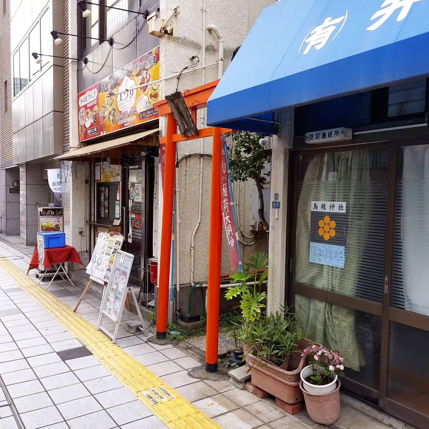 街を散策している時、お店に挟まれた小さな稲荷神社を見つけました。幹線道路沿…