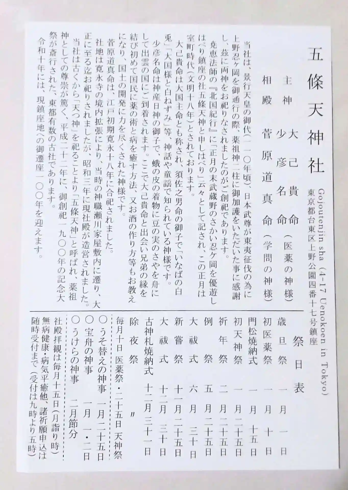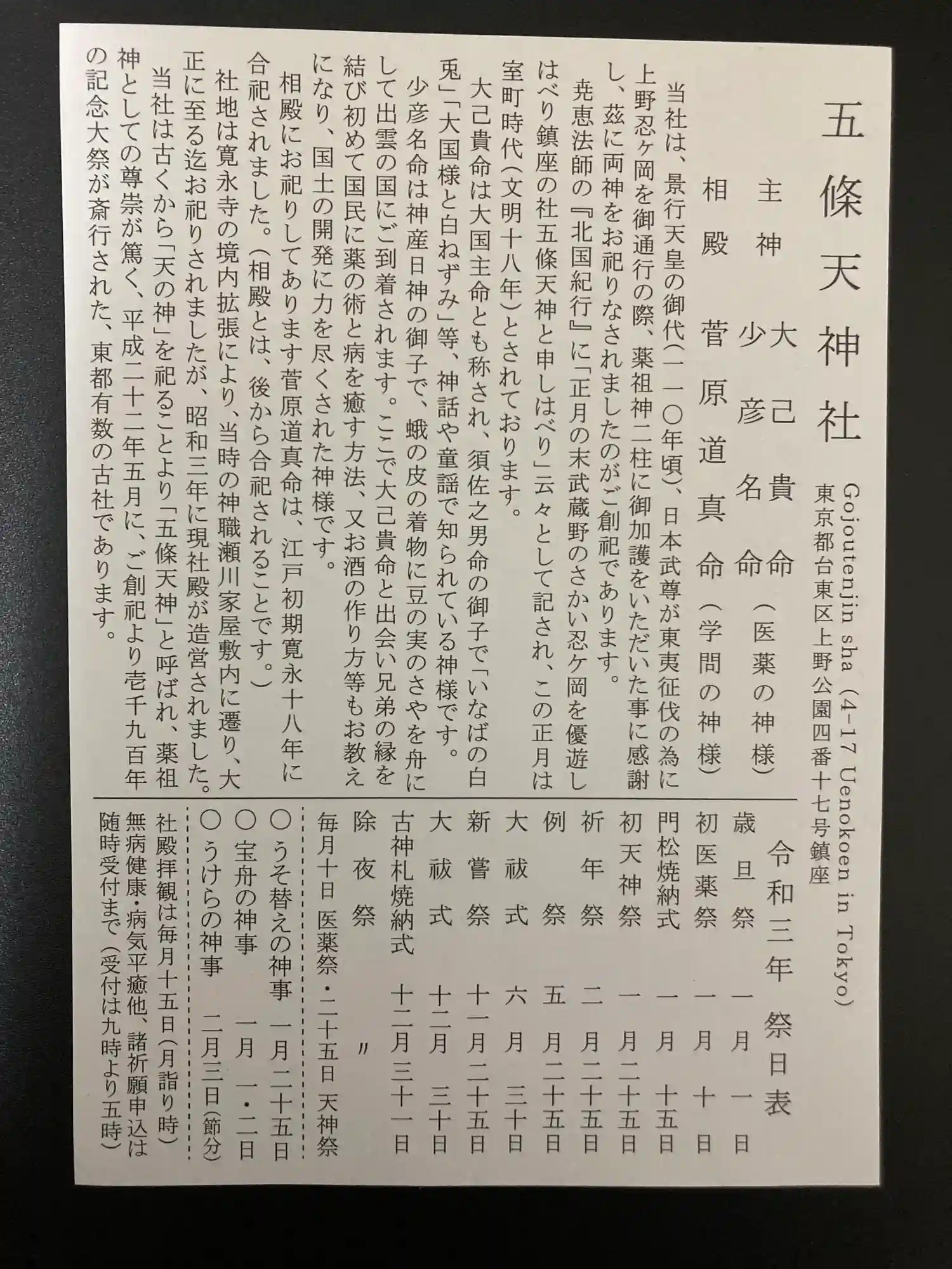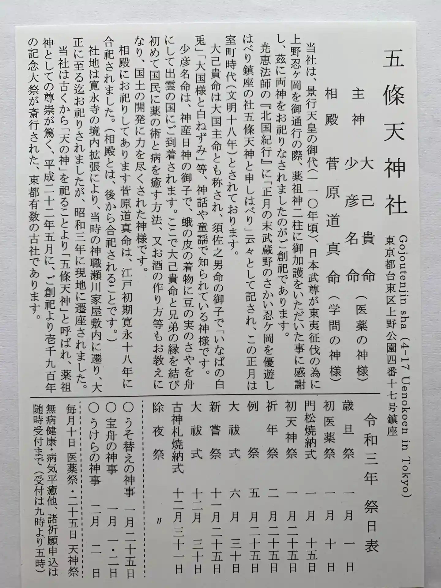 東京都台東区の五條天神社です。御祭神は大己貴命、少彦名命、菅原道真公です。