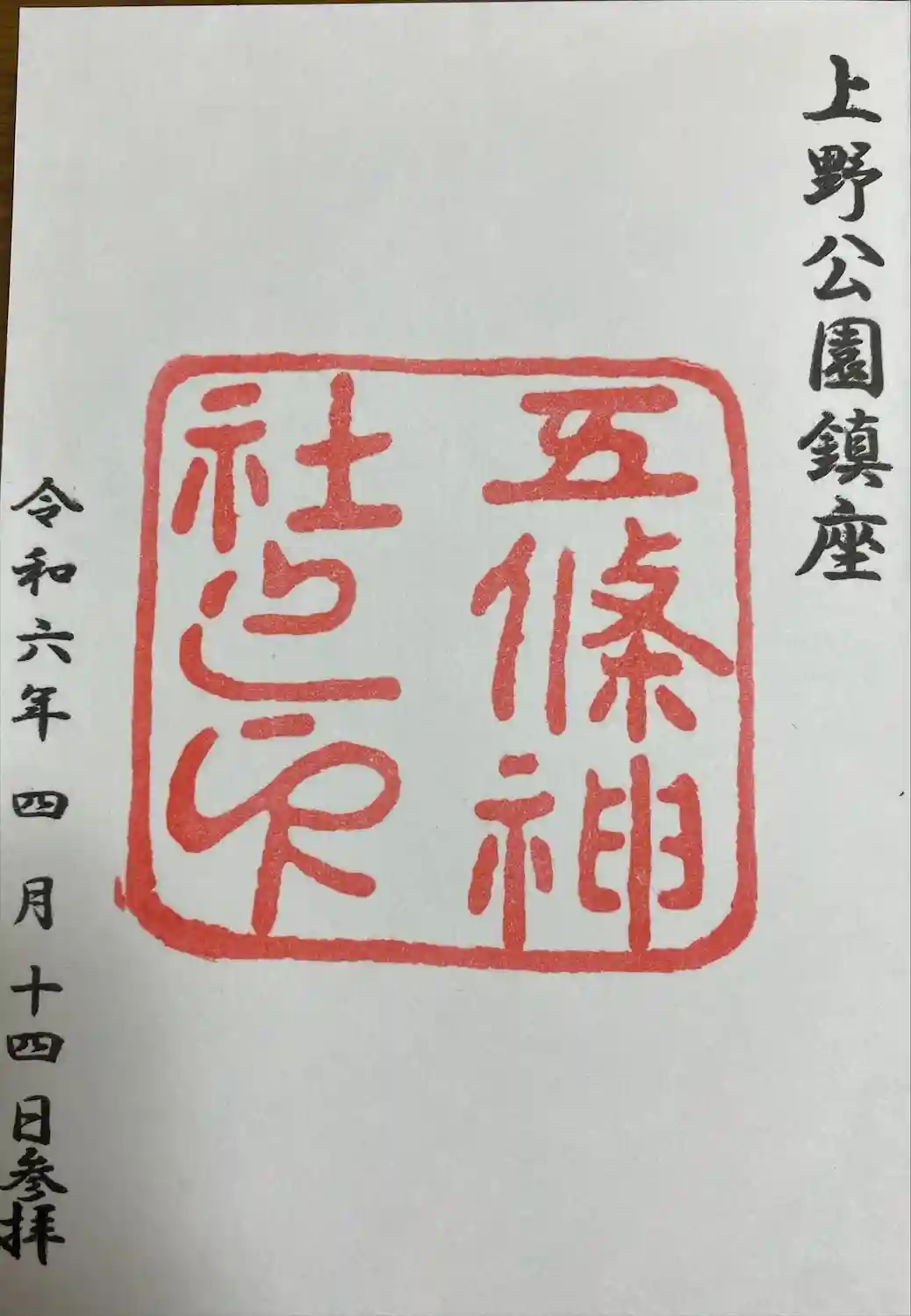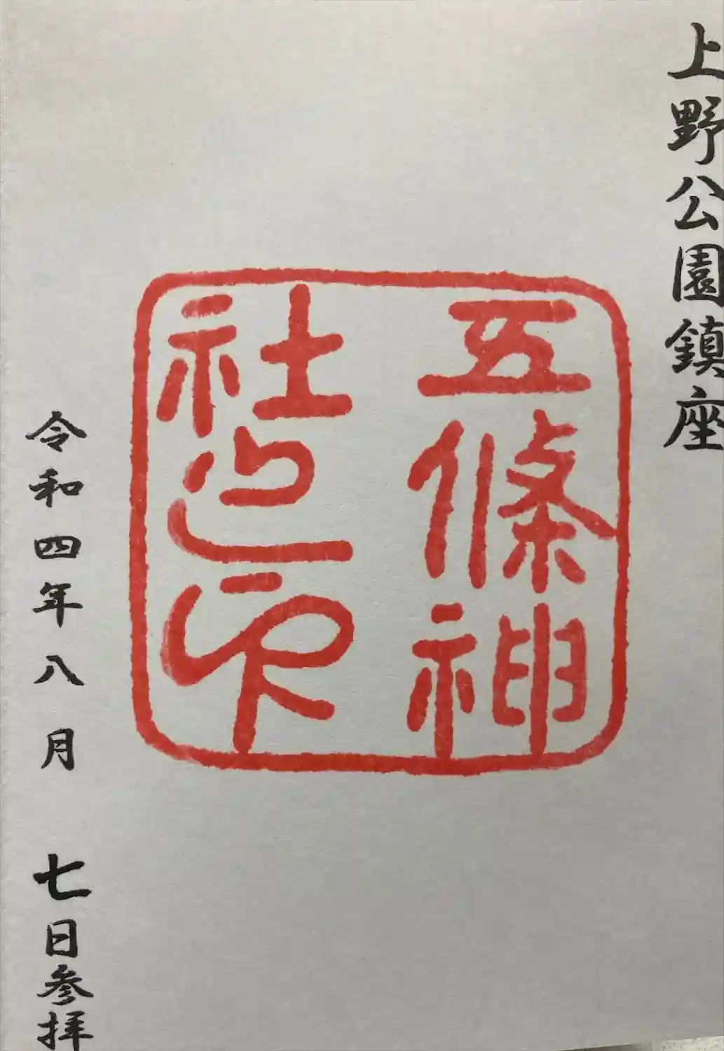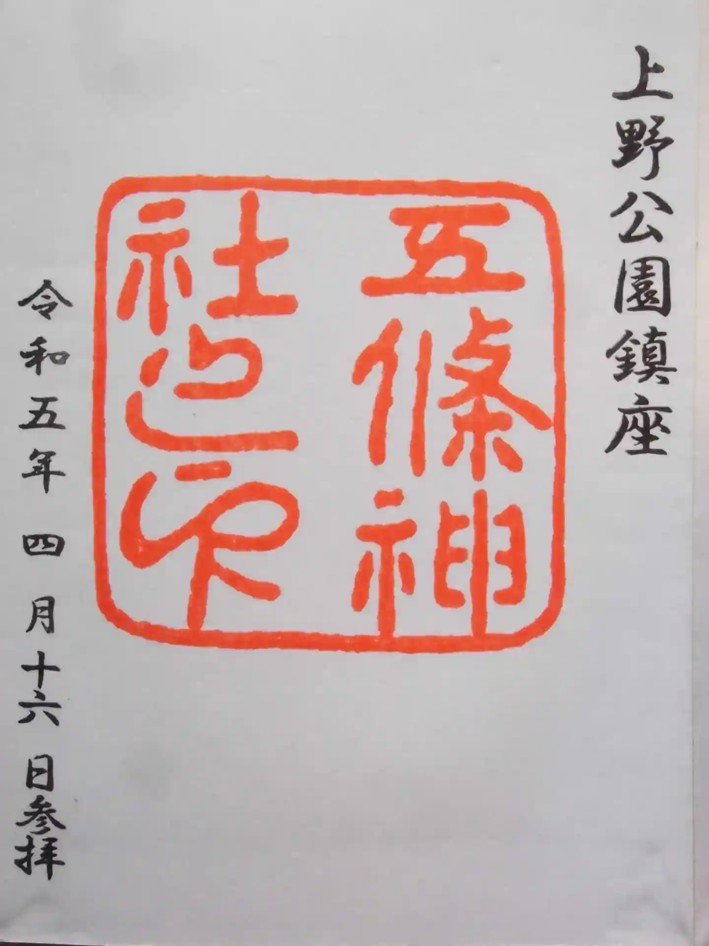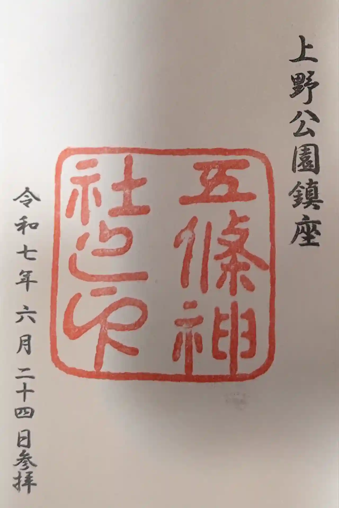 五條天神社(上野公園)の御朱印です。