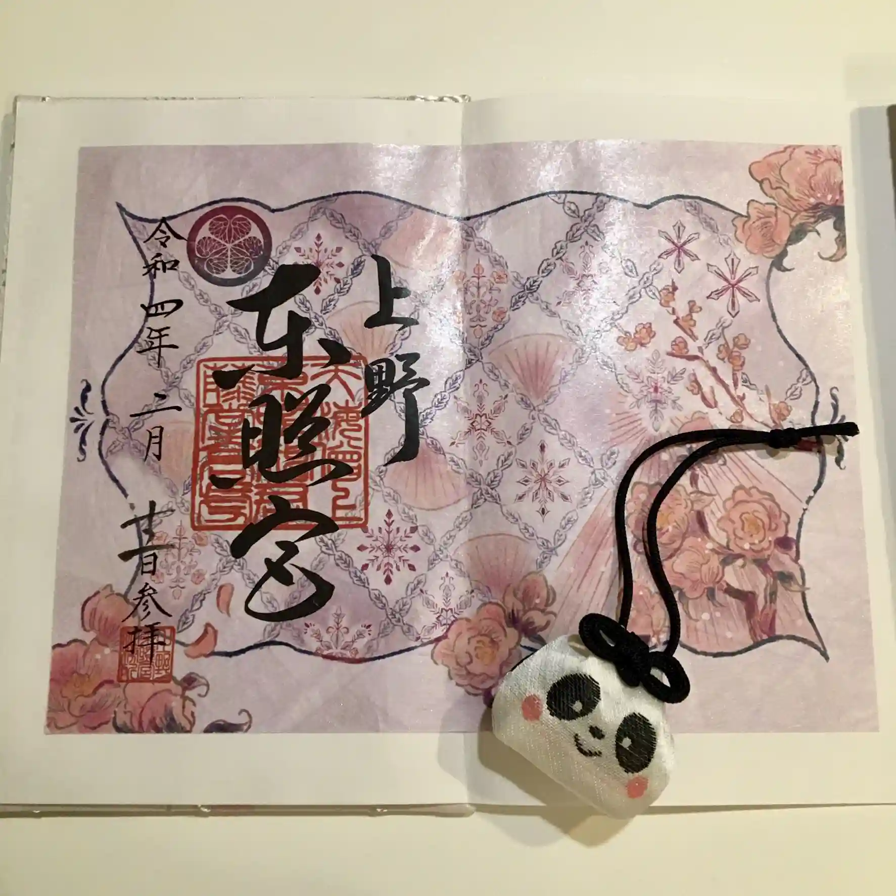 種類豊富で迷いましたが、今回は見開きの月替わり御朱印とパンダ守りをいただきました。