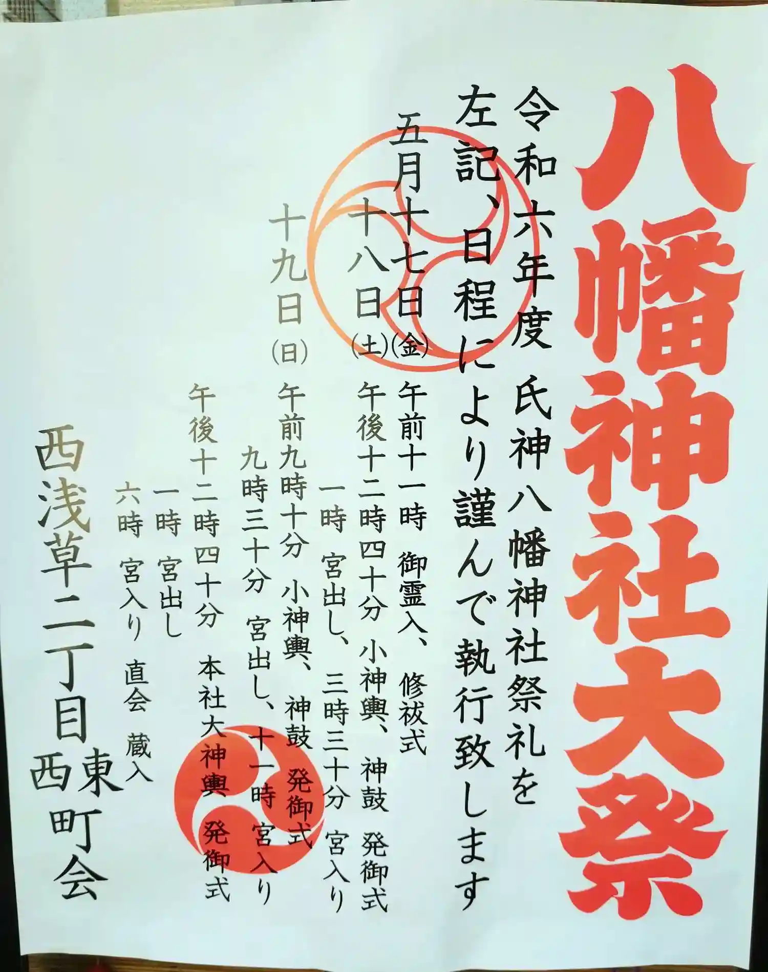 西浅草八幡神社管理人から皆様にお伝えします。今年度の八幡神社大祭は5月18日19日の両日となります…