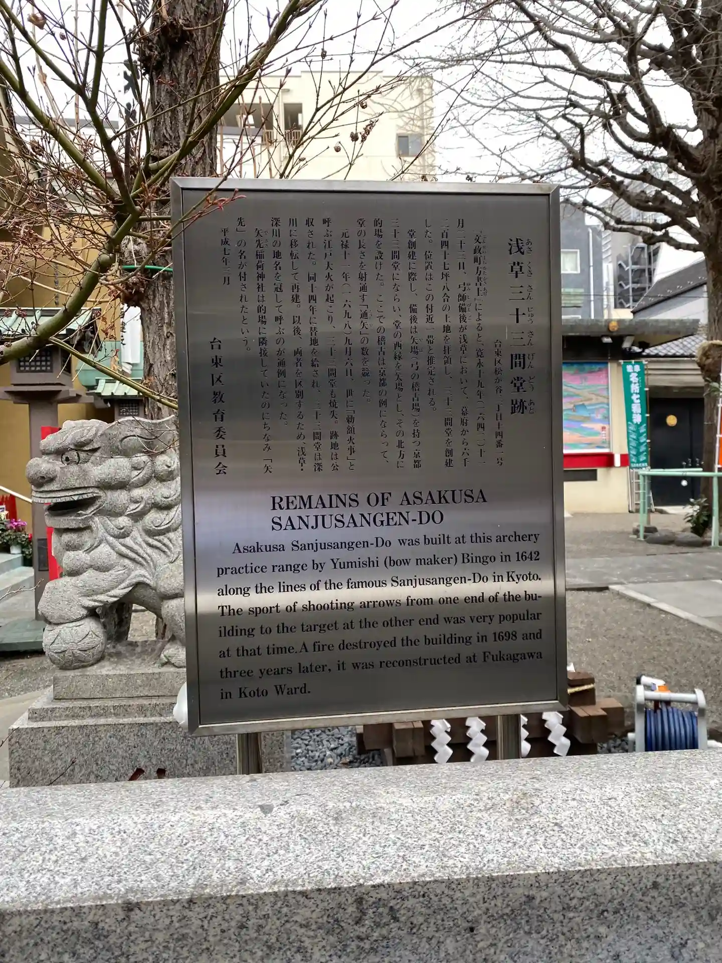武術興隆の目的で京都三十三間堂と同じものを浅草の今の地に建て、「矢先」の由来は、堂の廊下で「通し矢」が行われ、的先にあった神社で「矢先」と呼ばれたとのことです。