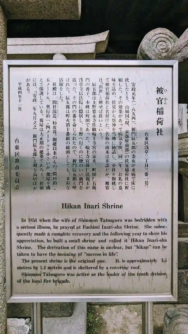 安政元年、新門辰五郎の妻が重病で床に伏したとき、山城(現•京都府南部)の伏見稲荷神社に祈願したところ、その効果あって病気は全快しました。同二年、町の人がお礼の意味も込め、伏見稲荷神社から祭神御分身を当地に勧請しました。その後、小社を創建し、被官稲荷神社と名付けられ、現在浅草神社の末社としてその境内に祀られています。名称の由来は不明ですが、被官とは官を被(こうむ)る、ということから、就職•出世と解せばよいでしょう。被官稲荷神社正面の鳥居は新門辰五郎により奉納されたものです。