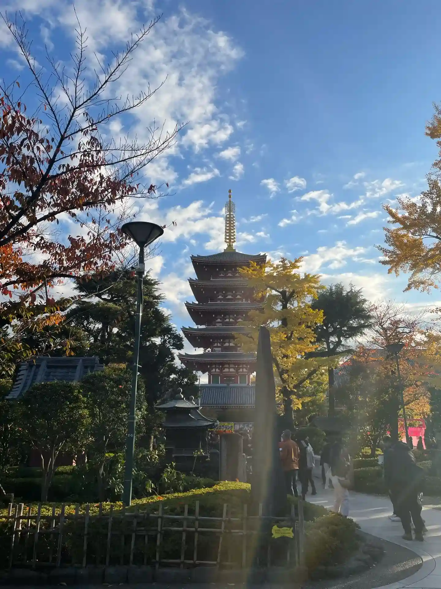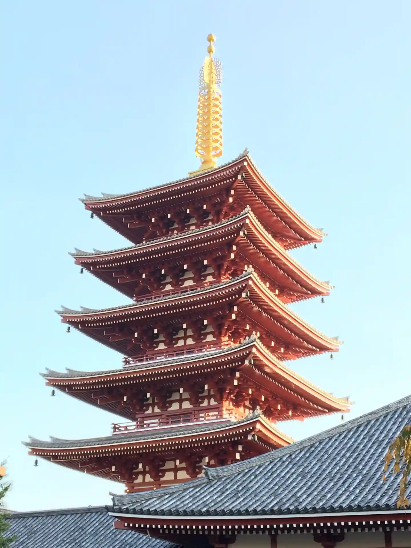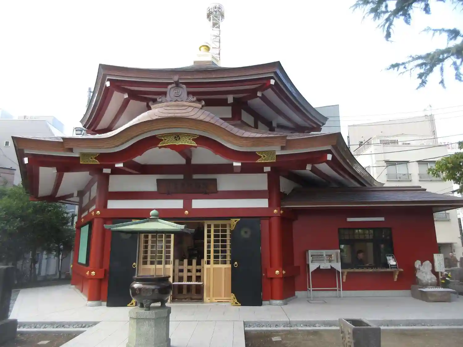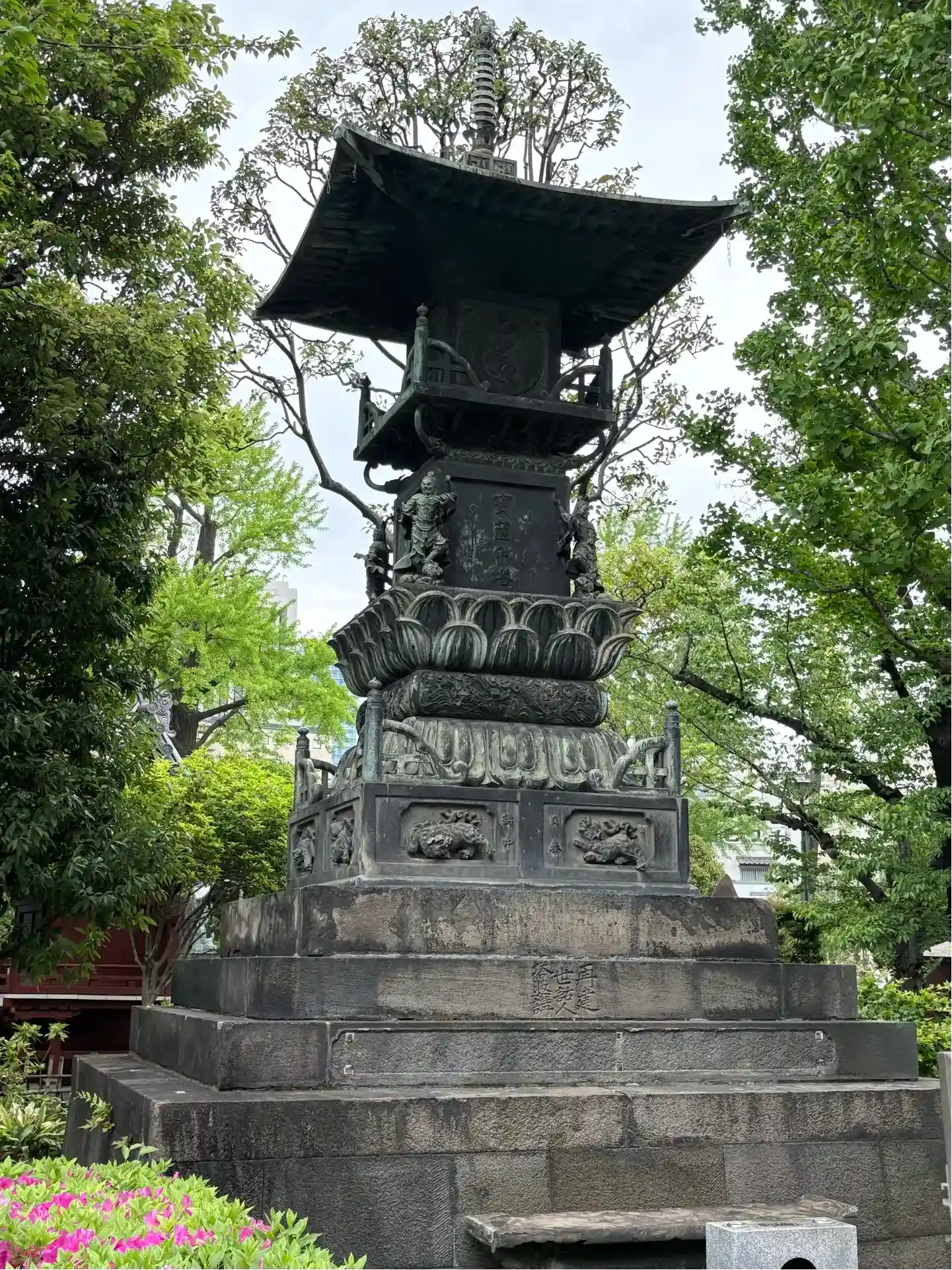 戦災による焼失を経て、昭和48(1973)年に再建された朱塗りの塔。