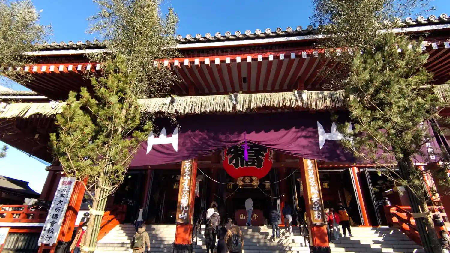 本堂側には山形県村山市の有志から奉納された高さ4.5mものわらじがかけられています。