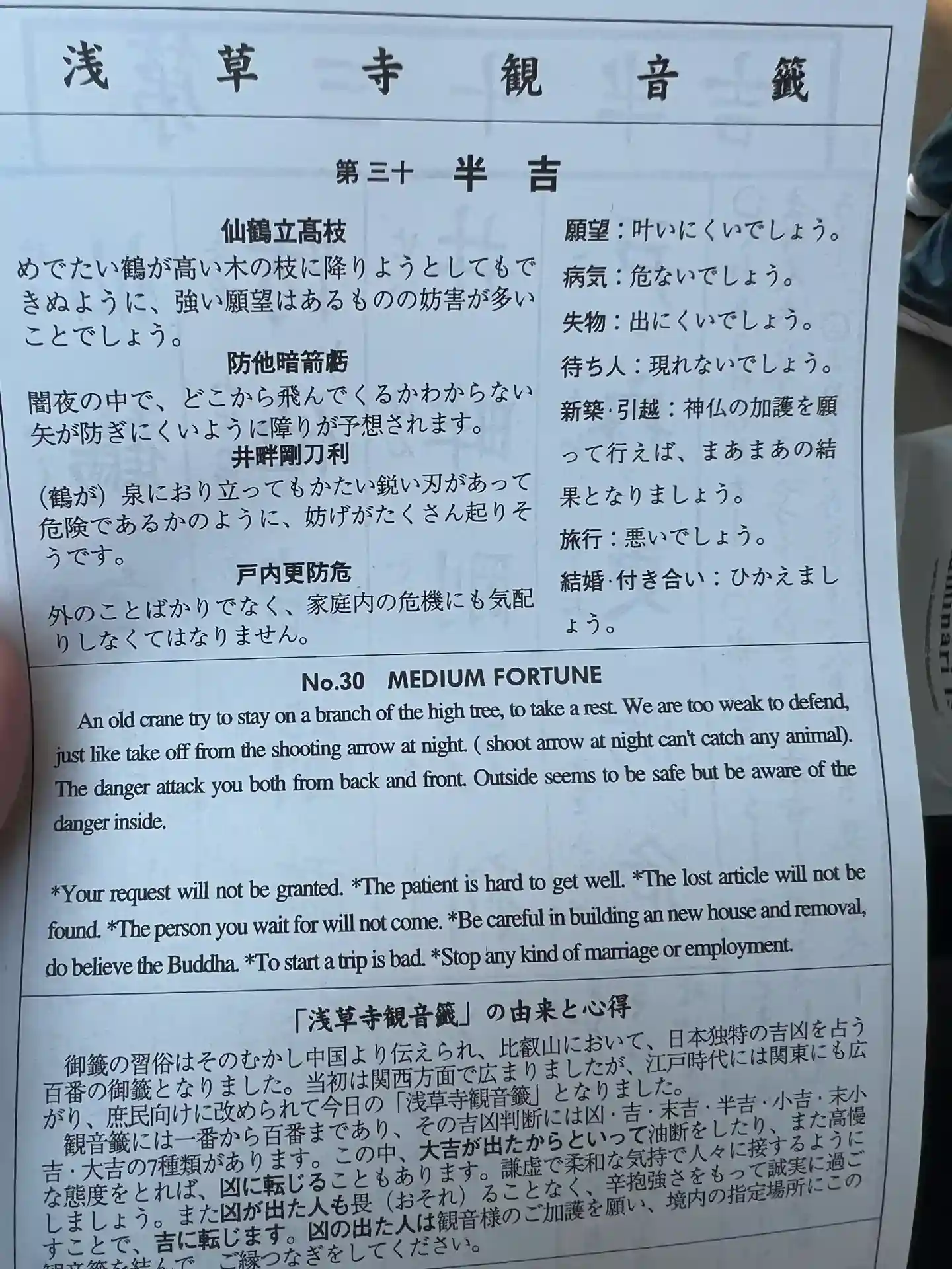 浅草寺のおみくじ。裏面はインバウンド対応で英語になってます。
