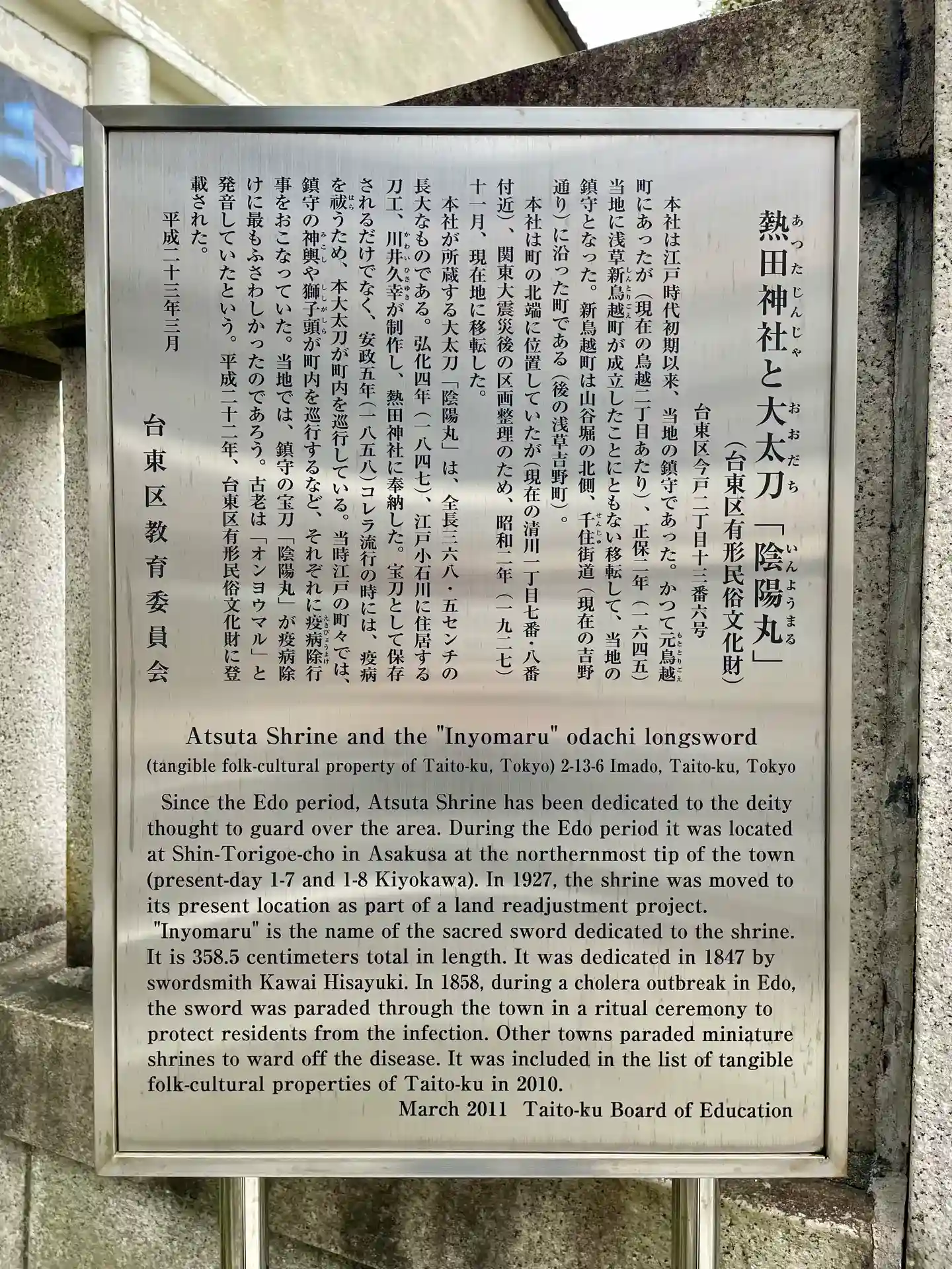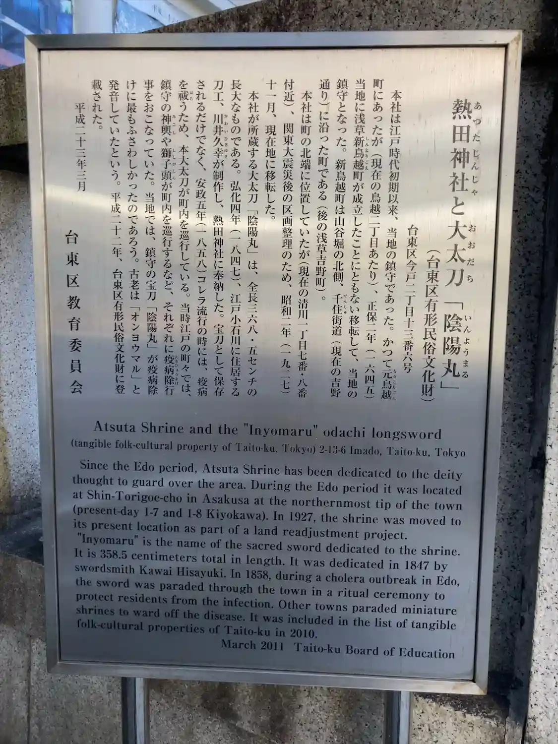 宝刀「陰陽丸」が所蔵されていて、安政五年にコレラが流行した際には疫…