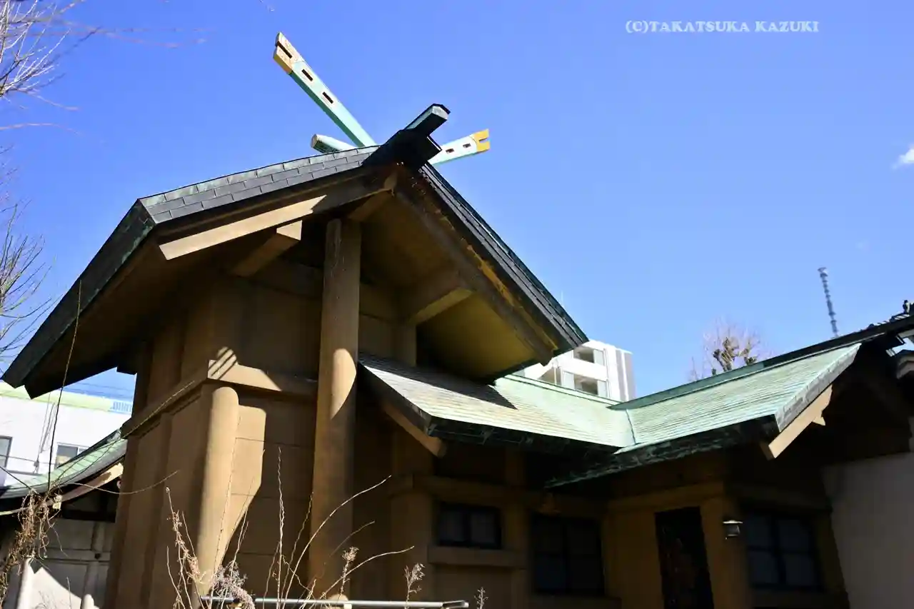 千木の色合いが空の青とあいまって、とても素敵でした。鳥越神社・榊神社と並んで鳥越三所明神と称される…
