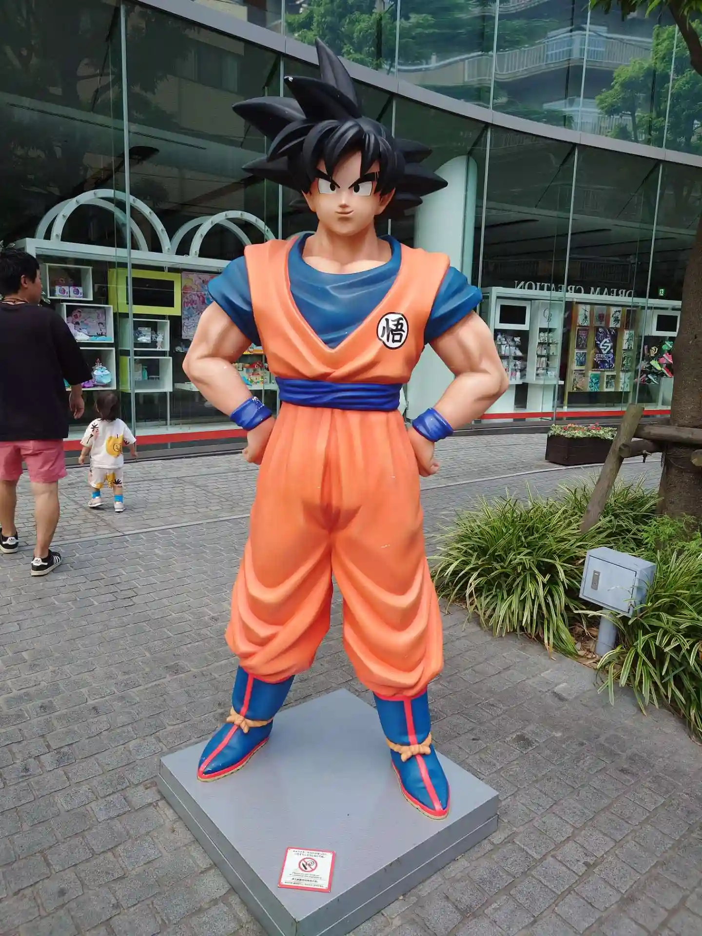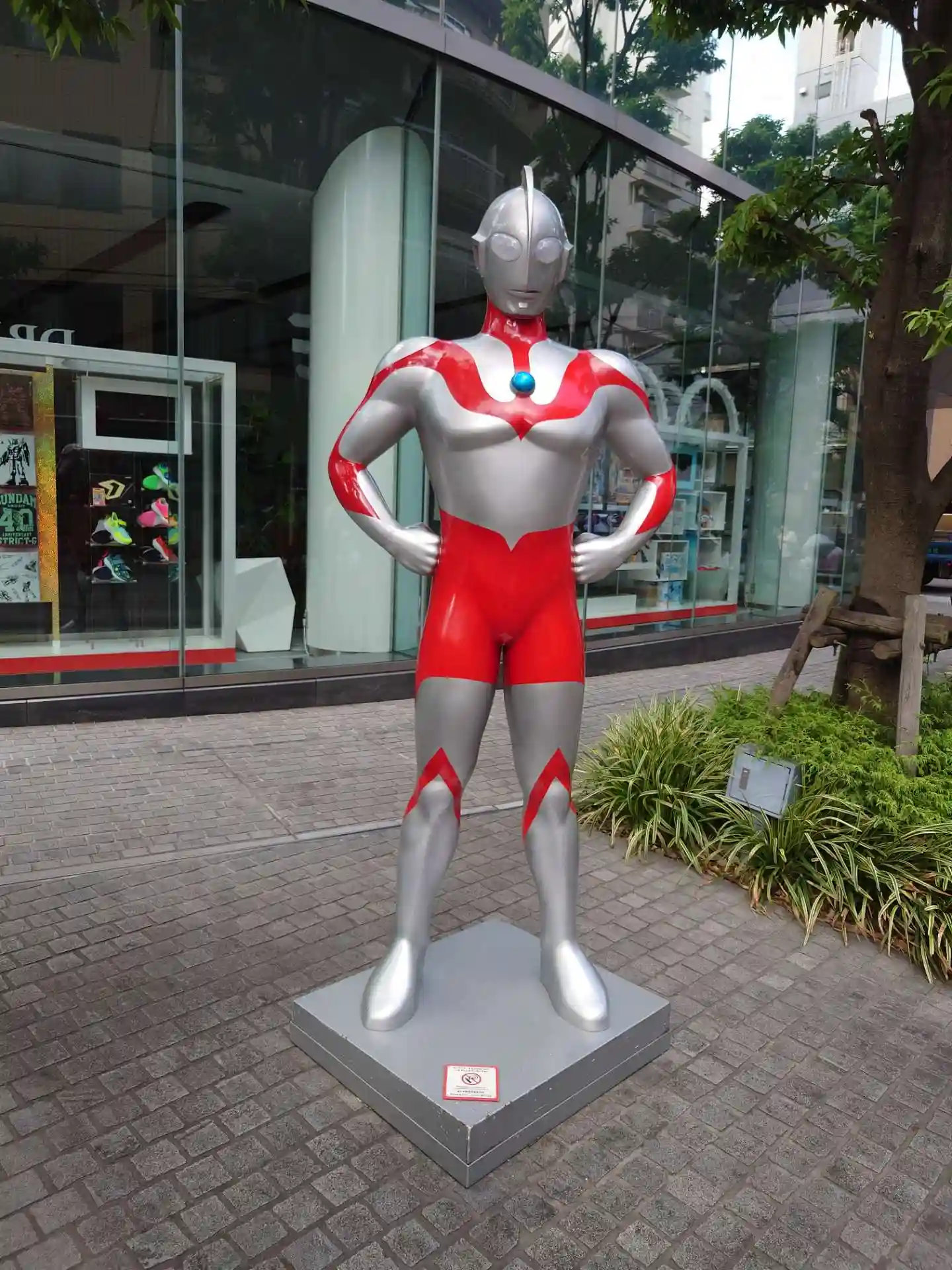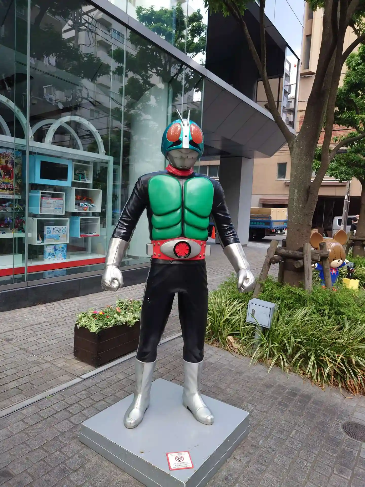 隣のバンダイ本社横の歩道にキャラクター人形勢揃い