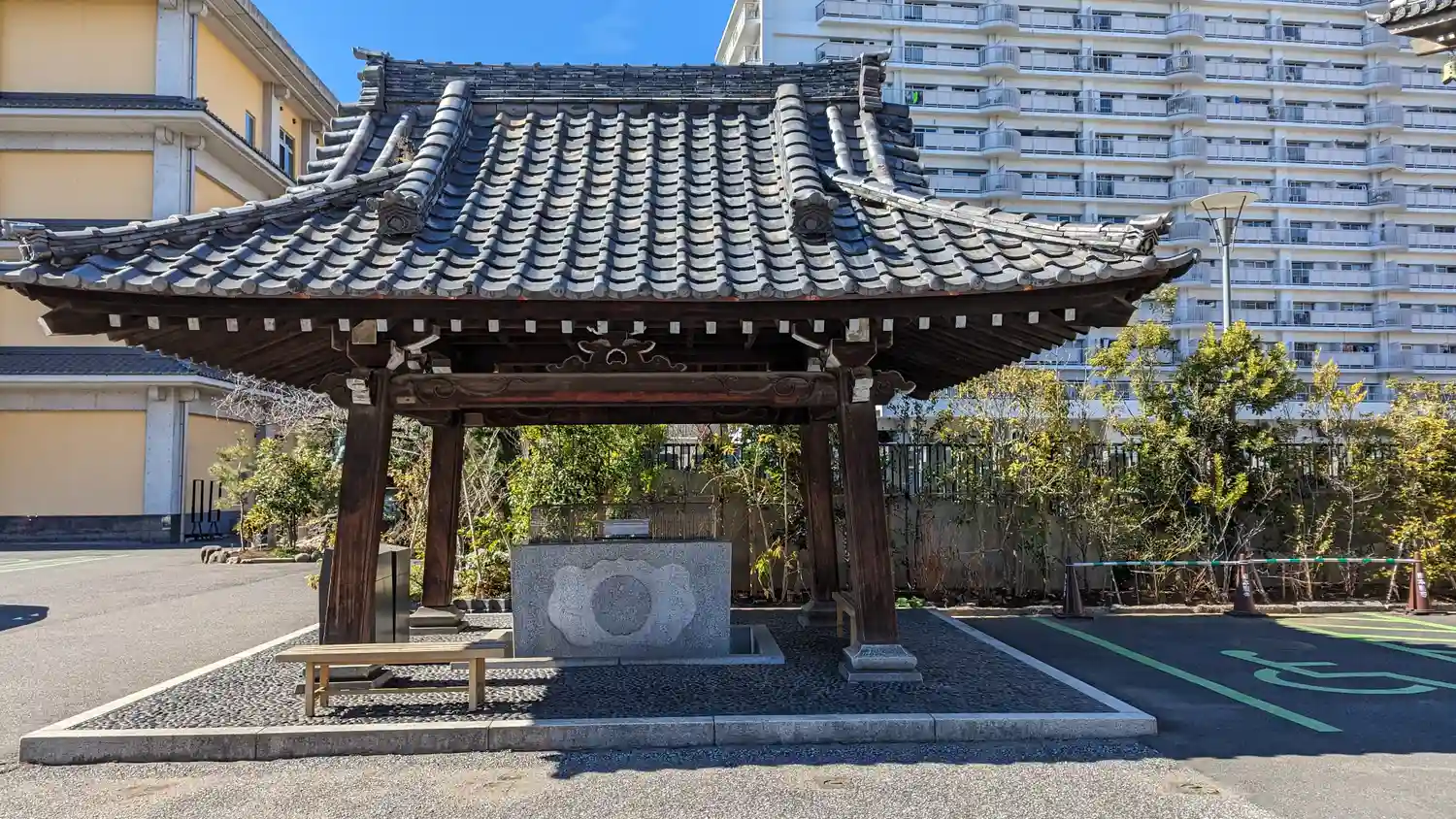 手水舎の左奥が、門信徒会館「慈光殿」