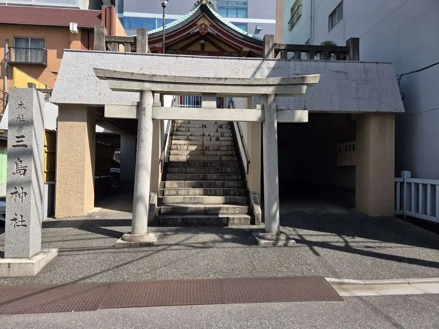 1階が駐車場と特徴的な作りになっています。建替え中の三島神社にお伺いした時にも思いましたが、都心付近で神社やその社地を維持していくのは大変なんでしょうねぇ⋯。鳥居を潜って先の石段を登って拝殿に向かい、ご挨拶して参りました。また、拝殿左手には境内社もあります。