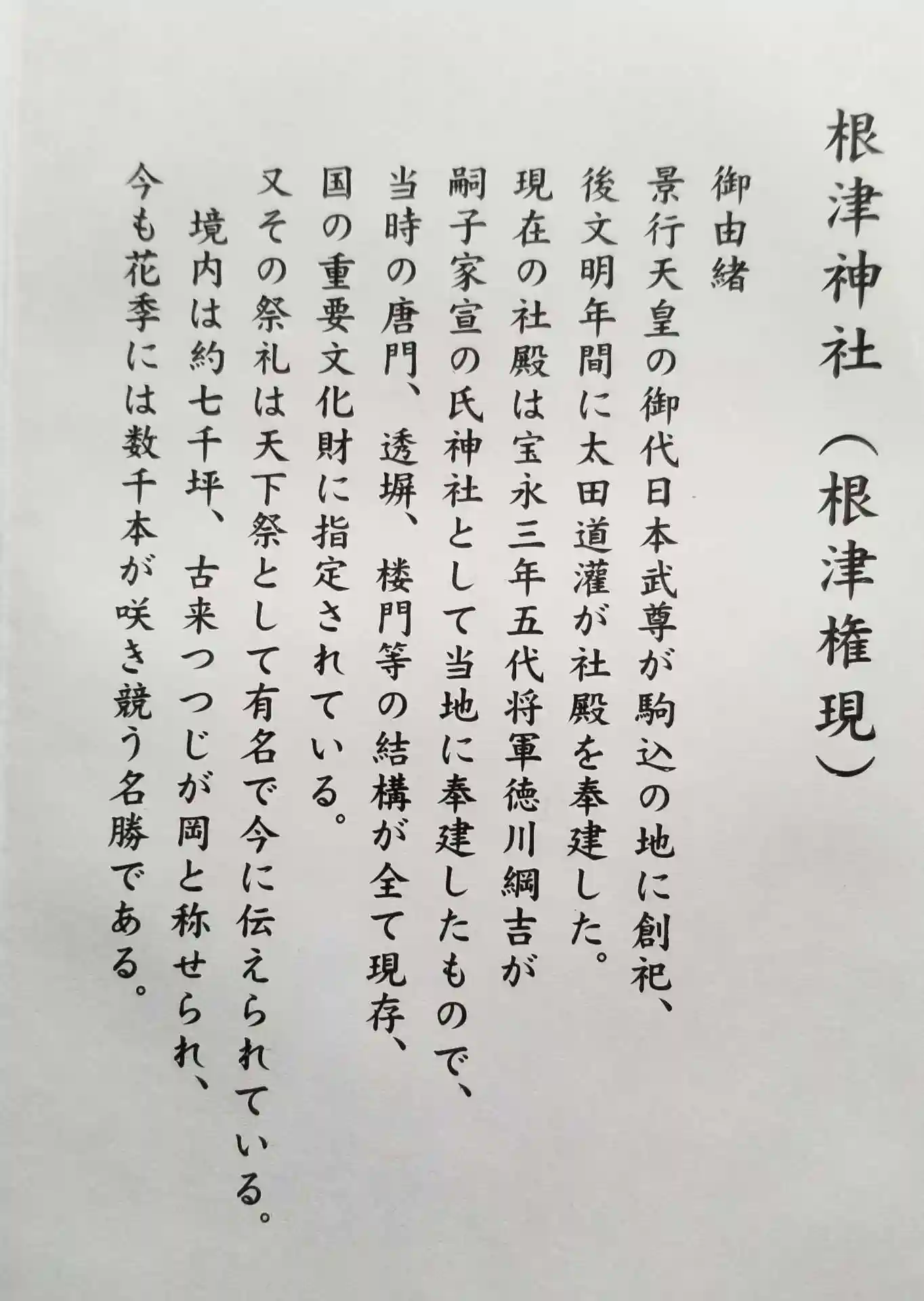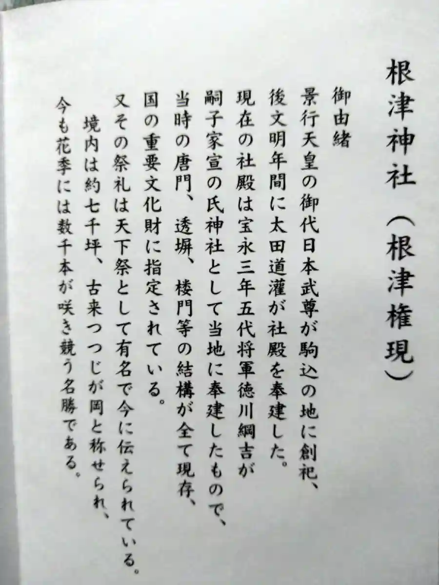 根津神社の御由緒書。